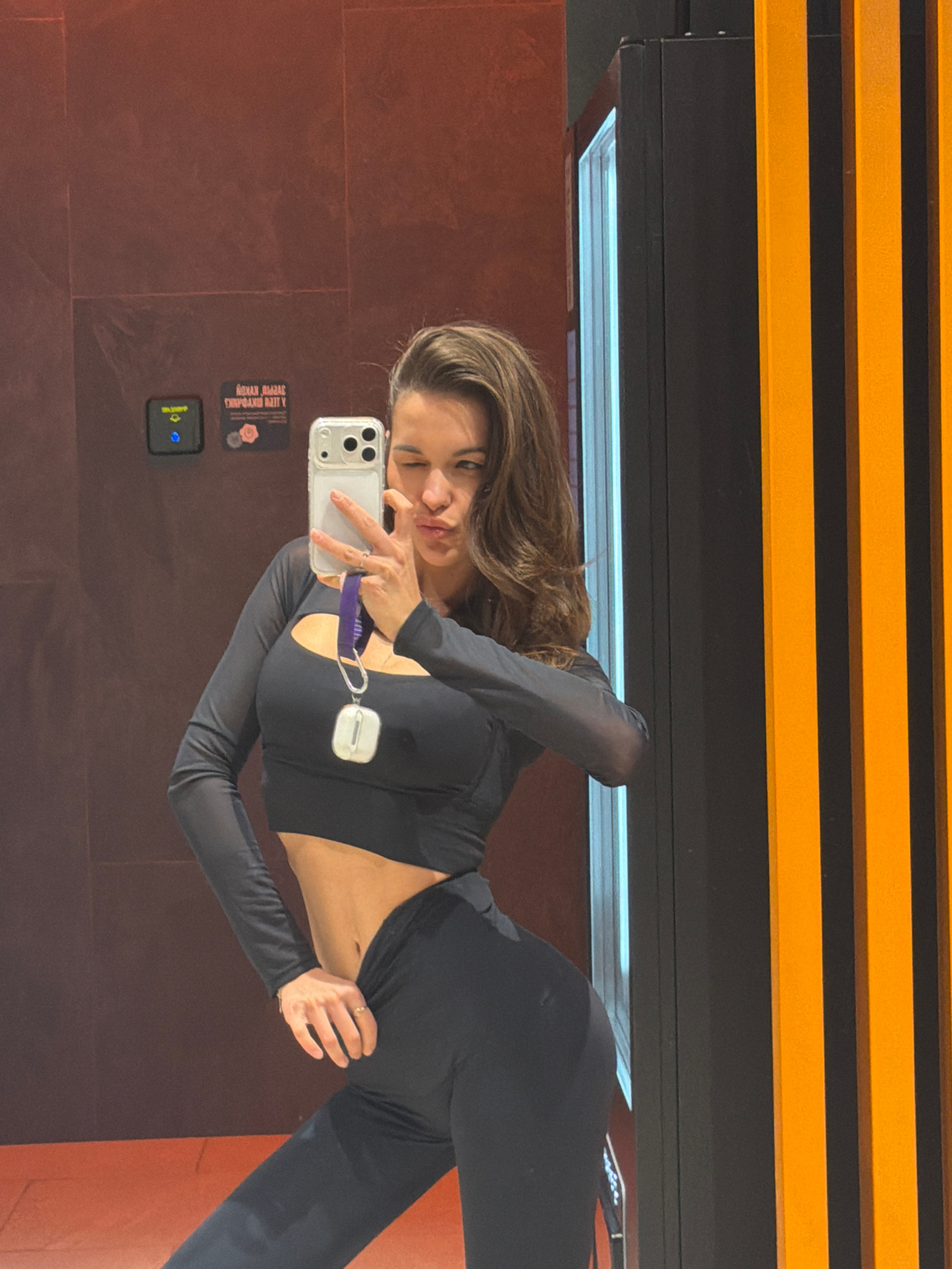 A young woman with long brown hair takes a selfie in a bathroom. She is wearing a black long-sleeved crop top and black pants. She is holding a white smartphone in her left hand, and her right hand is…read more