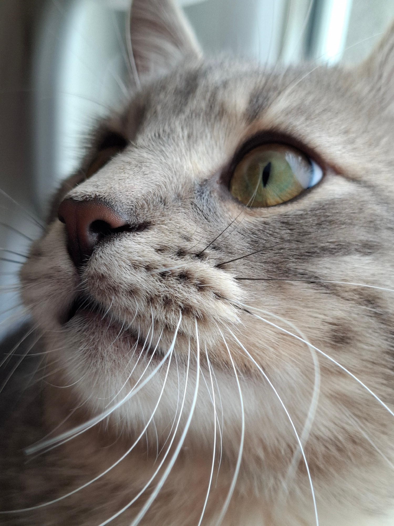 A close-up shot shows the face of a tabby cat. The cat has light gray fur with darker stripes. Its nose is pink, and it has long white whiskers. One eye is visible, displaying a green iris with a blac…read more