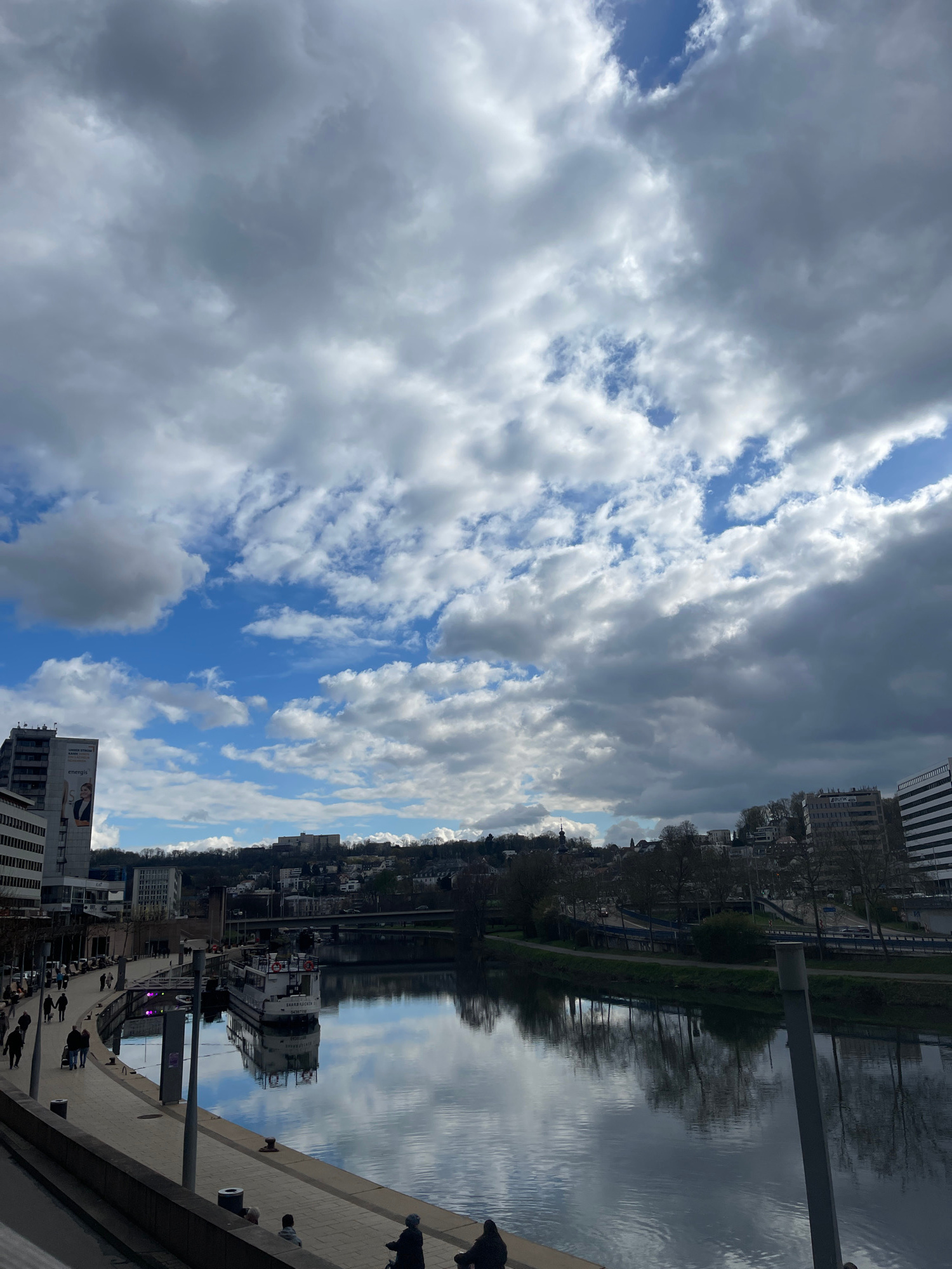 The image captures a cityscape in Saarbrücken, Germany, featuring a body of water likely the Saar River. On the right side, a paved promenade with people walking is visible. The river reflects the sky…read more