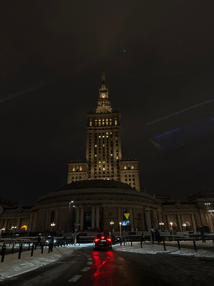 The image displays the Palace of Culture and Science (Pałac Kultury i Nauki) in Warsaw, Poland, captured at night during winter. The monumental building is centrally framed, illuminated by numerous wa…read more