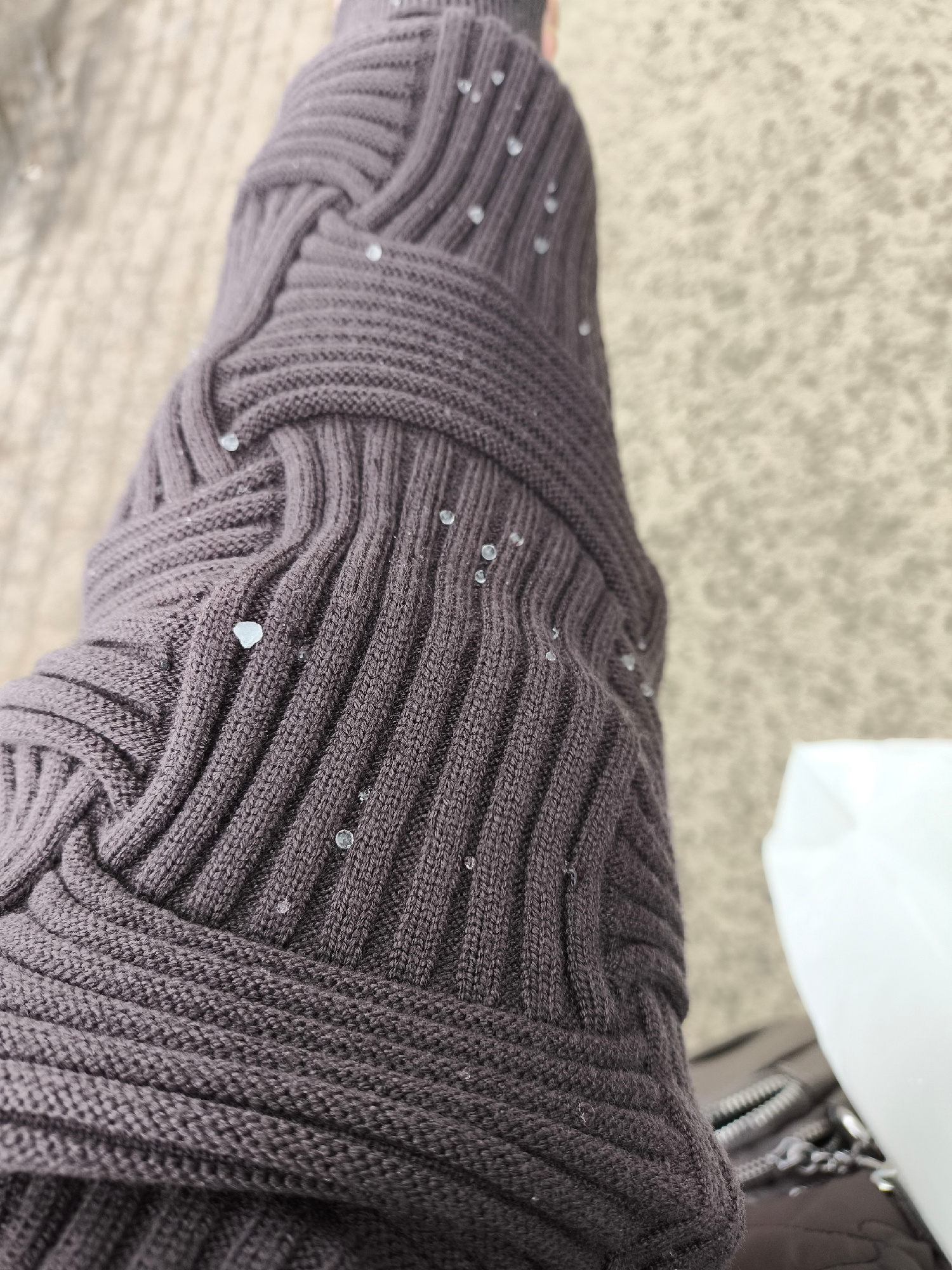 A close-up shot depicts a sleeve of a dark grey knitted sweater adorned with small, clear, bead-like embellishments scattered across its surface. The textured fabric features a ribbed pattern, with th…read more