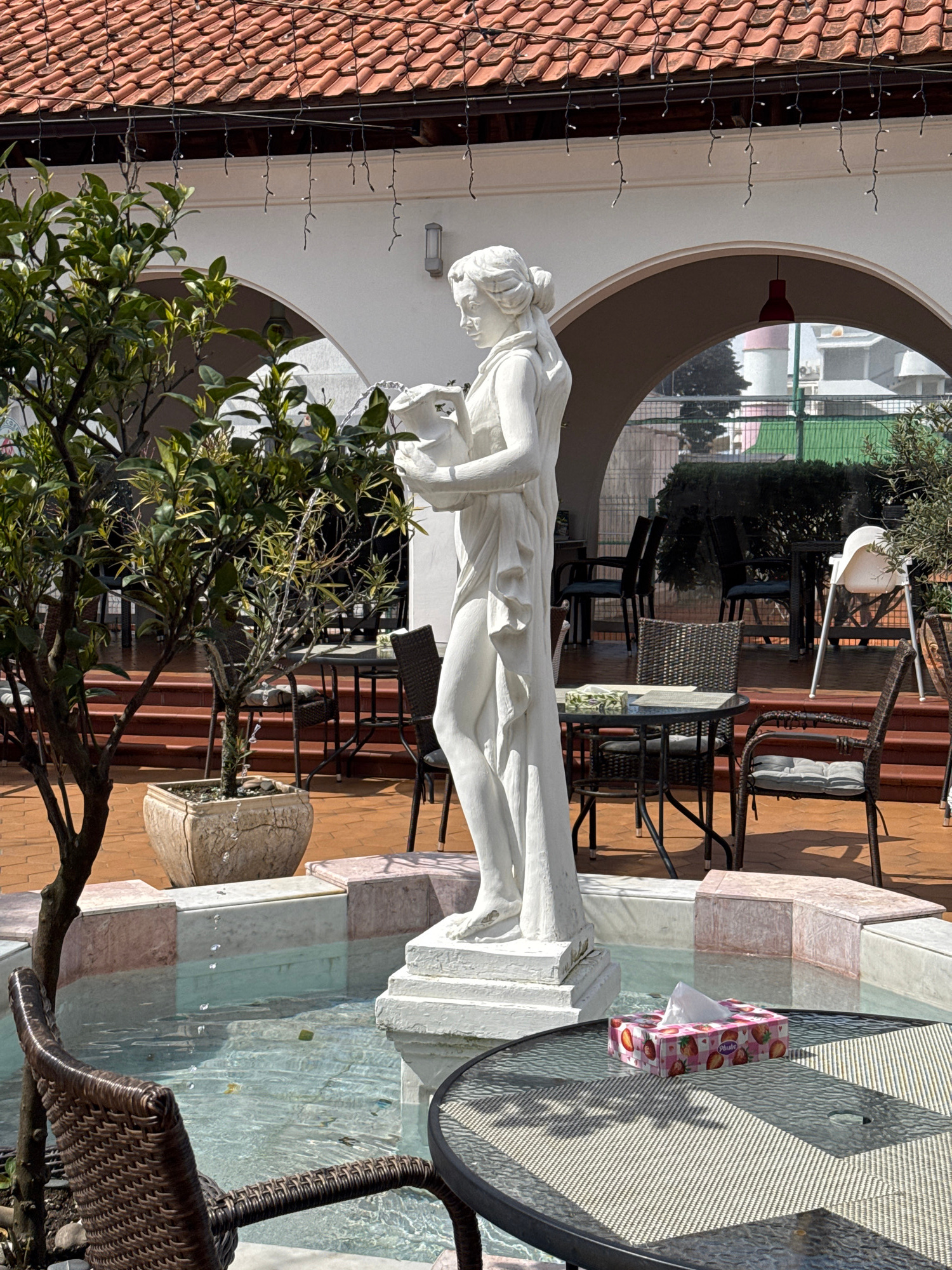 Here is a description of the image: The image depicts an outdoor scene, possibly a patio or garden setting. A white marble statue of a draped female figure stands prominently in the foreground. To thβ¦read more
