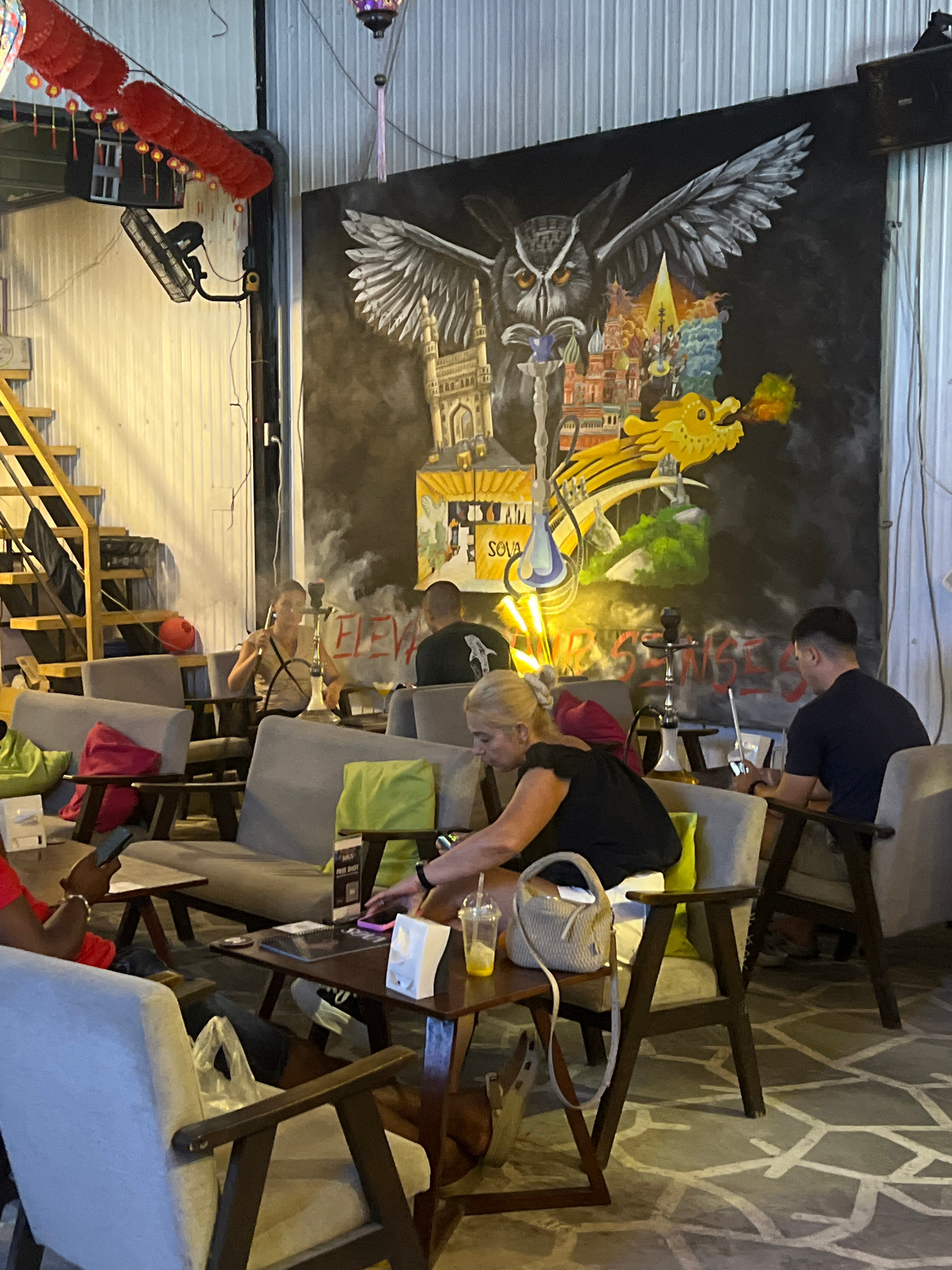 The image shows an indoor space in Đà Nẵng, Vietnam, with people seated at tables, apparently in a hookah lounge or similar establishment. The focus is on a group of individuals engaged in smoking hoo…read more