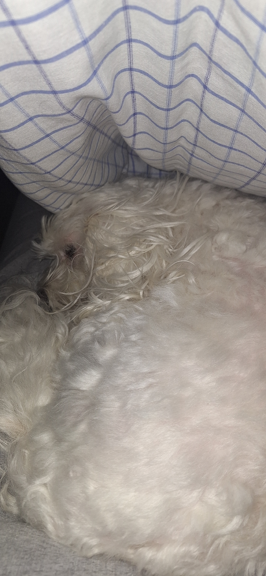 The image shows a close-up of a white, fluffy dog lying on a bed. The dog is positioned next to a pillow with a blue and white checkered pattern. The background appears to be a gray blanket. There are…read more