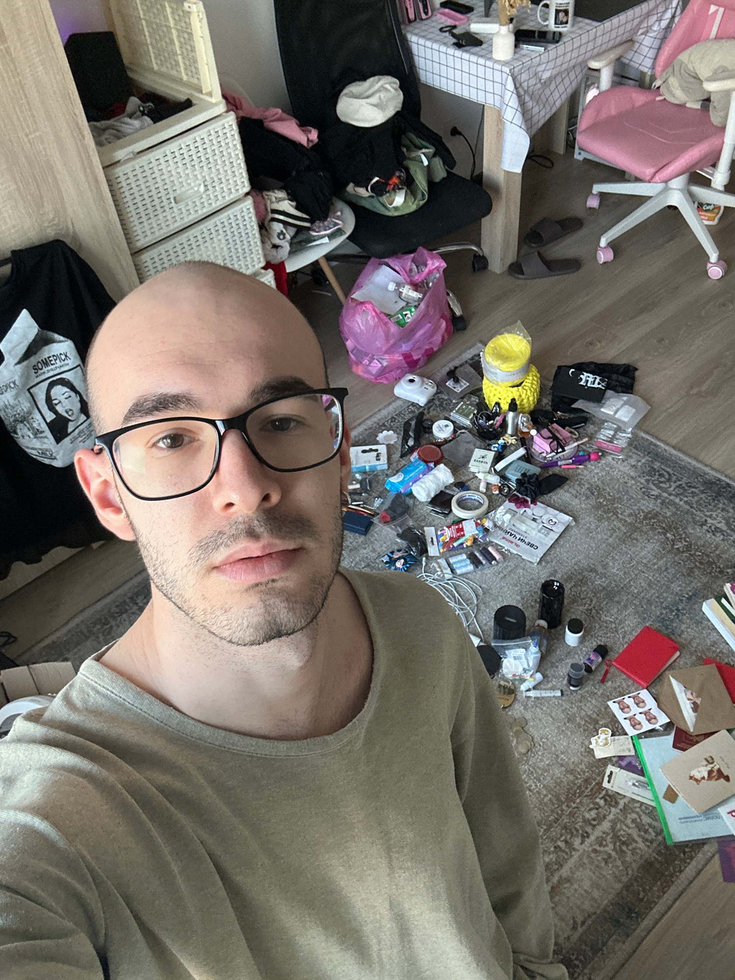 The image shows a man with a shaved head and glasses, wearing a light green sweatshirt. He is indoors, in what appears to be a cluttered room. To his left, there is a desk with white plastic storage b…read more