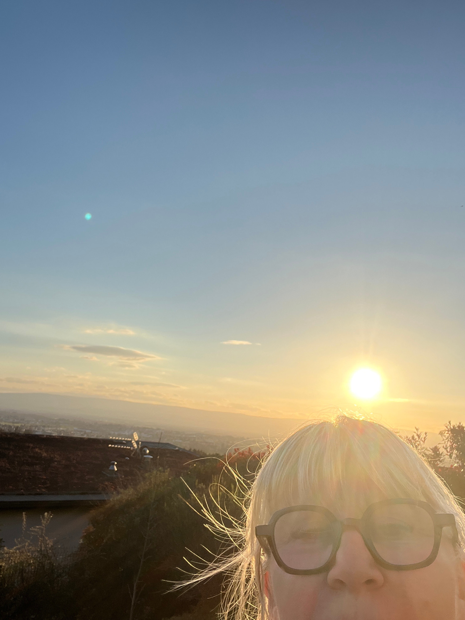 The image is an angled outdoor shot with a woman in the right side of the frame wearing glasses and with fair hair; the sun is above her head. The background shows a city view in a valley under a blue…read more