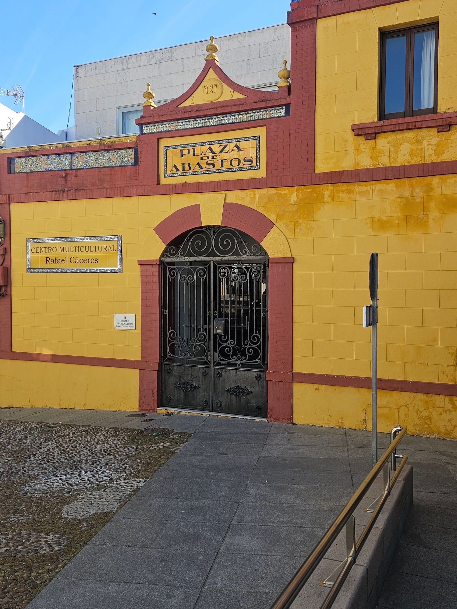 The image shows the facade of the Plaza de Abastos, now the Centro Multicultural Rafael Cáceres, in Pedro Abad, Spain. The building is two stories, constructed of yellow brick with red brick trim arou…read more