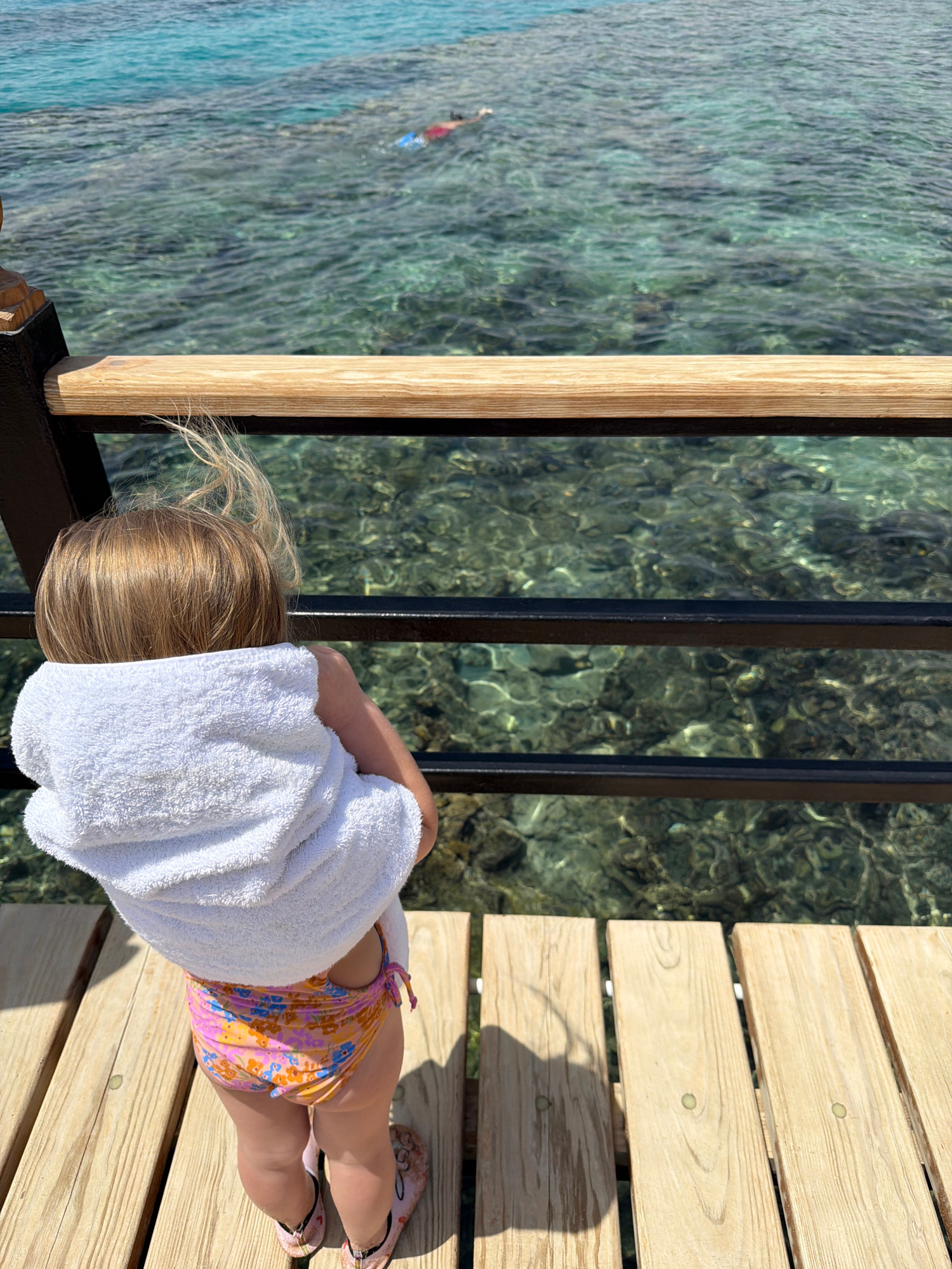 A top-down shot shows a young child on a wooden pier in Sharm El Sheikh, Egypt. The child, wearing a floral swimsuit and light-colored shoes, is partially covered with a white towel. The pier's railinβ¦read more