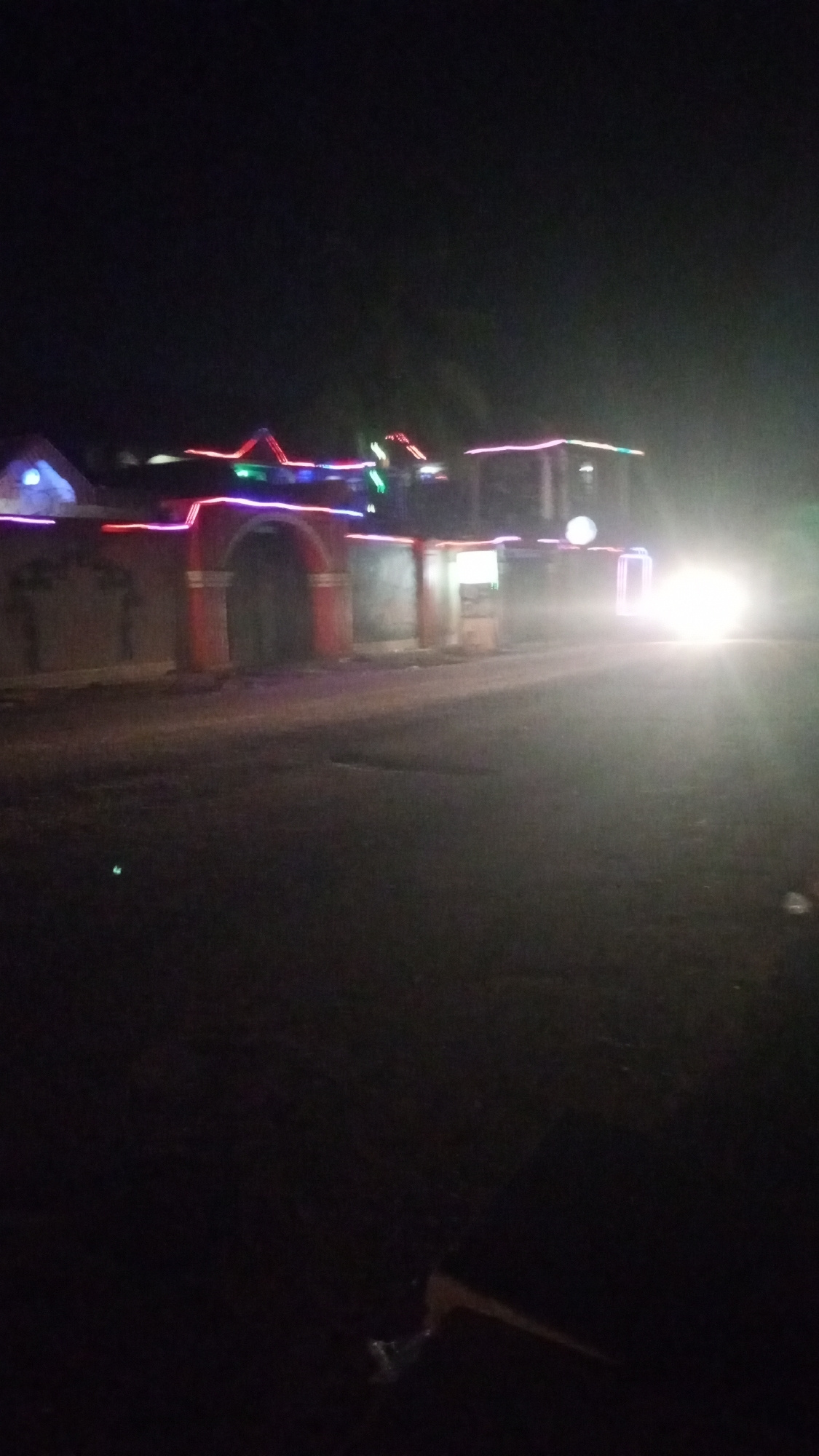 At night in Sabon Tasha, Nigeria, a brightly lit vehicle approaches on a road. Buildings are decorated with colorful lights. The architecture is a mix of residential and commercial, featuring arched e…read more