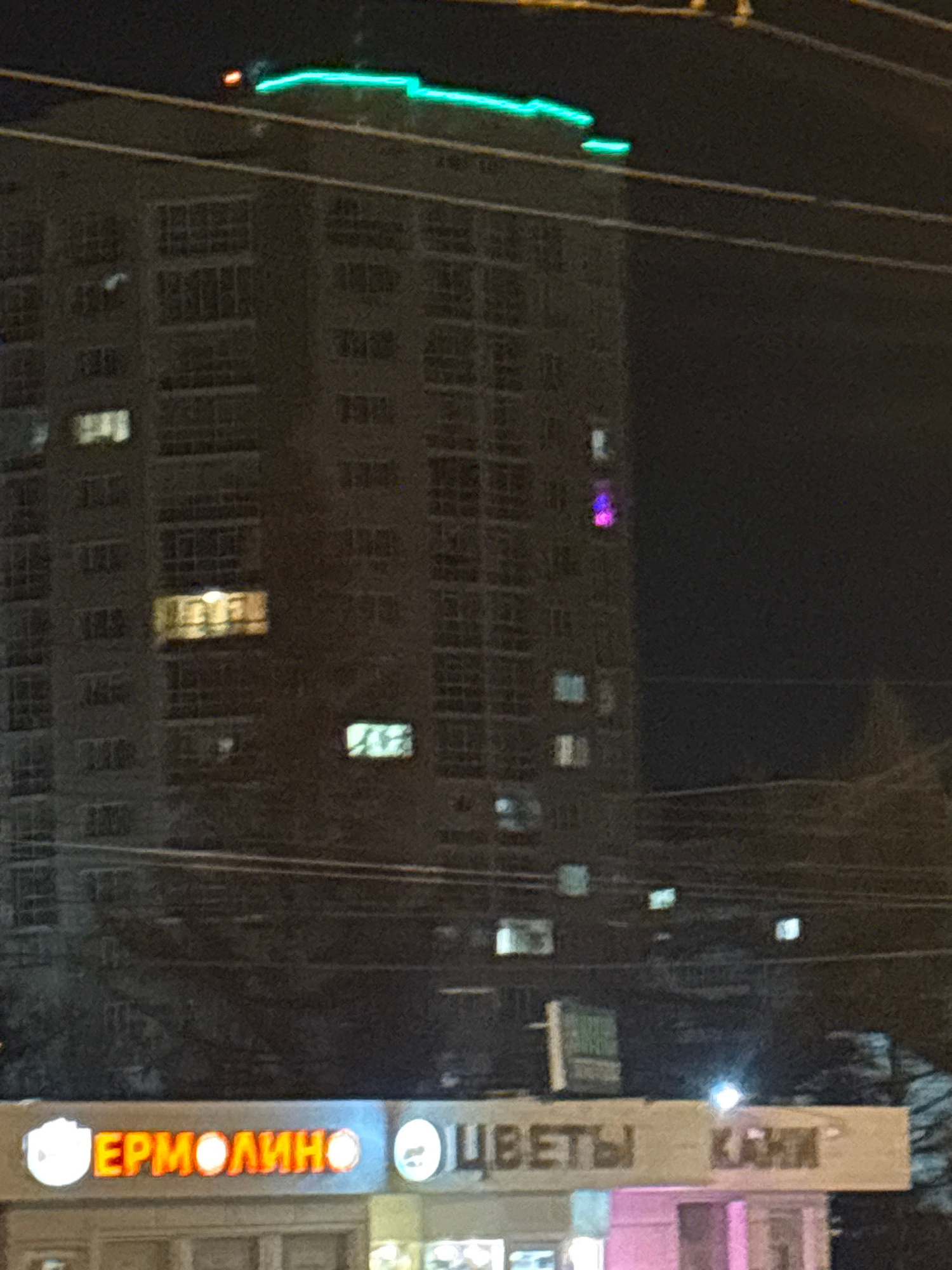 The image depicts a nighttime urban scene in Krasnoyarsk, Russia. An apartment building with illuminated windows occupies the left and center. To the right, vertical signs read "ЕРМОЛИНО" and "ЦВЕТЫ К…read more