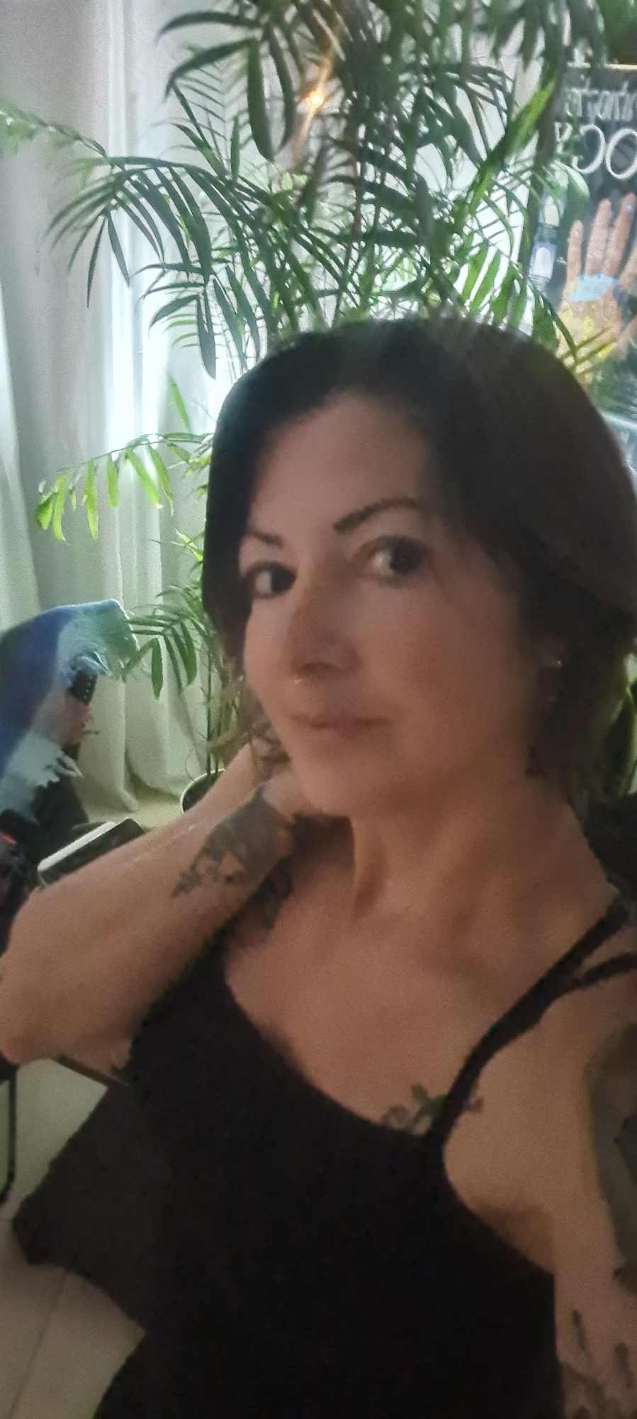 A person is visible, positioned against a backdrop of green foliage, possibly an indoor plant. The person has dark hair, light skin, and is wearing a black top. There is visible tattooed skin on the a…read more