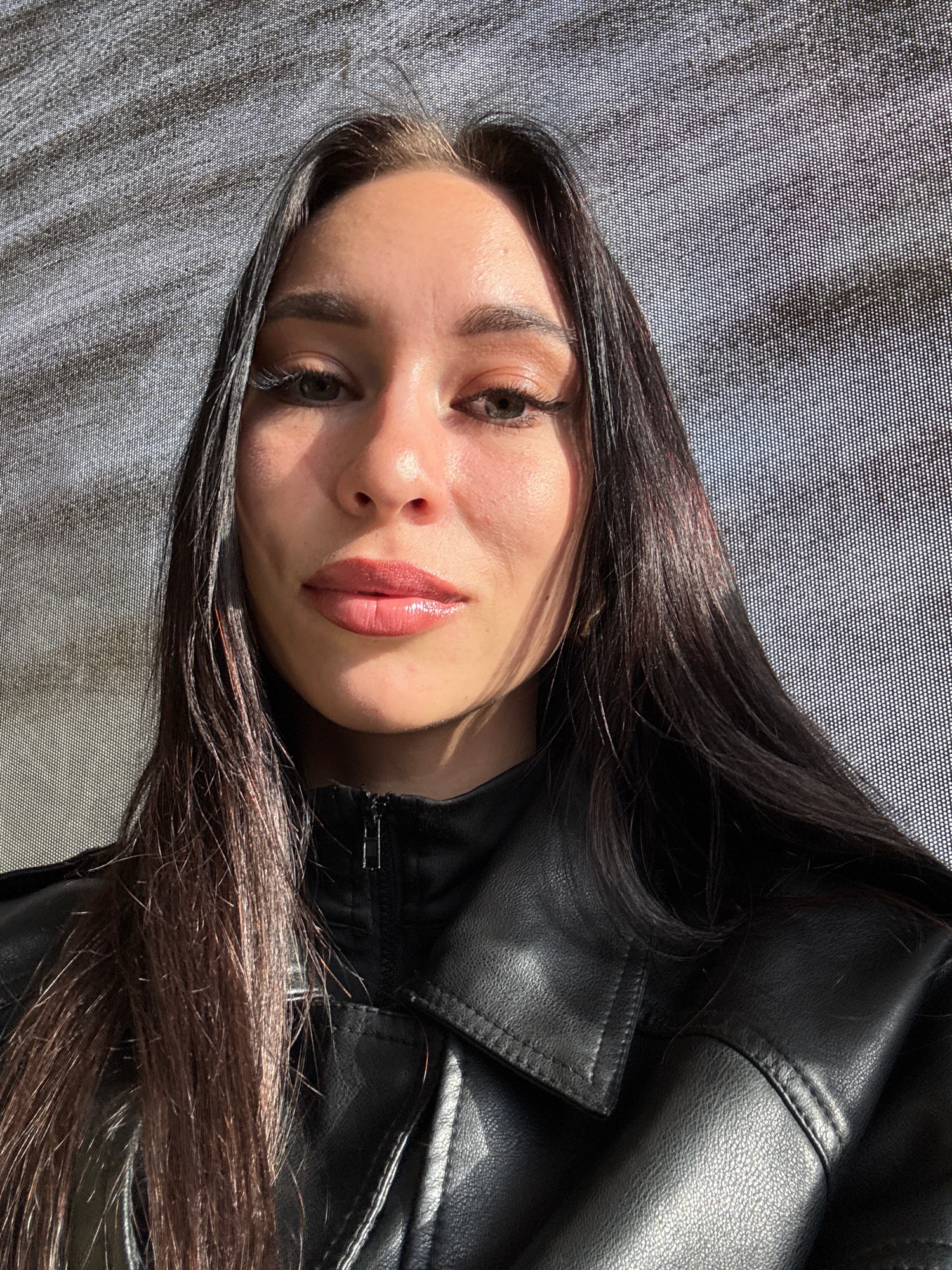 An eye-level close-up shows a young woman looking directly at the camera, positioned horizontally. Her face, seen from the mid-forehead to the chin, occupies the left side of the frame. She has dark,…read more