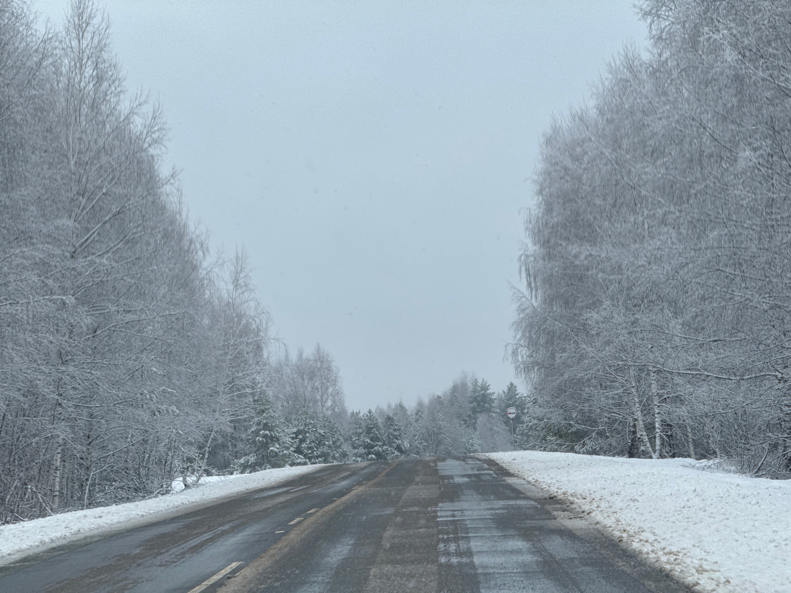 The image depicts a snow-covered road in Zhigalki, Russia. The road is wet and reflects the overcast sky. Snow blankets the ground on either side of the road and clings to the bare branches of trees l…read more