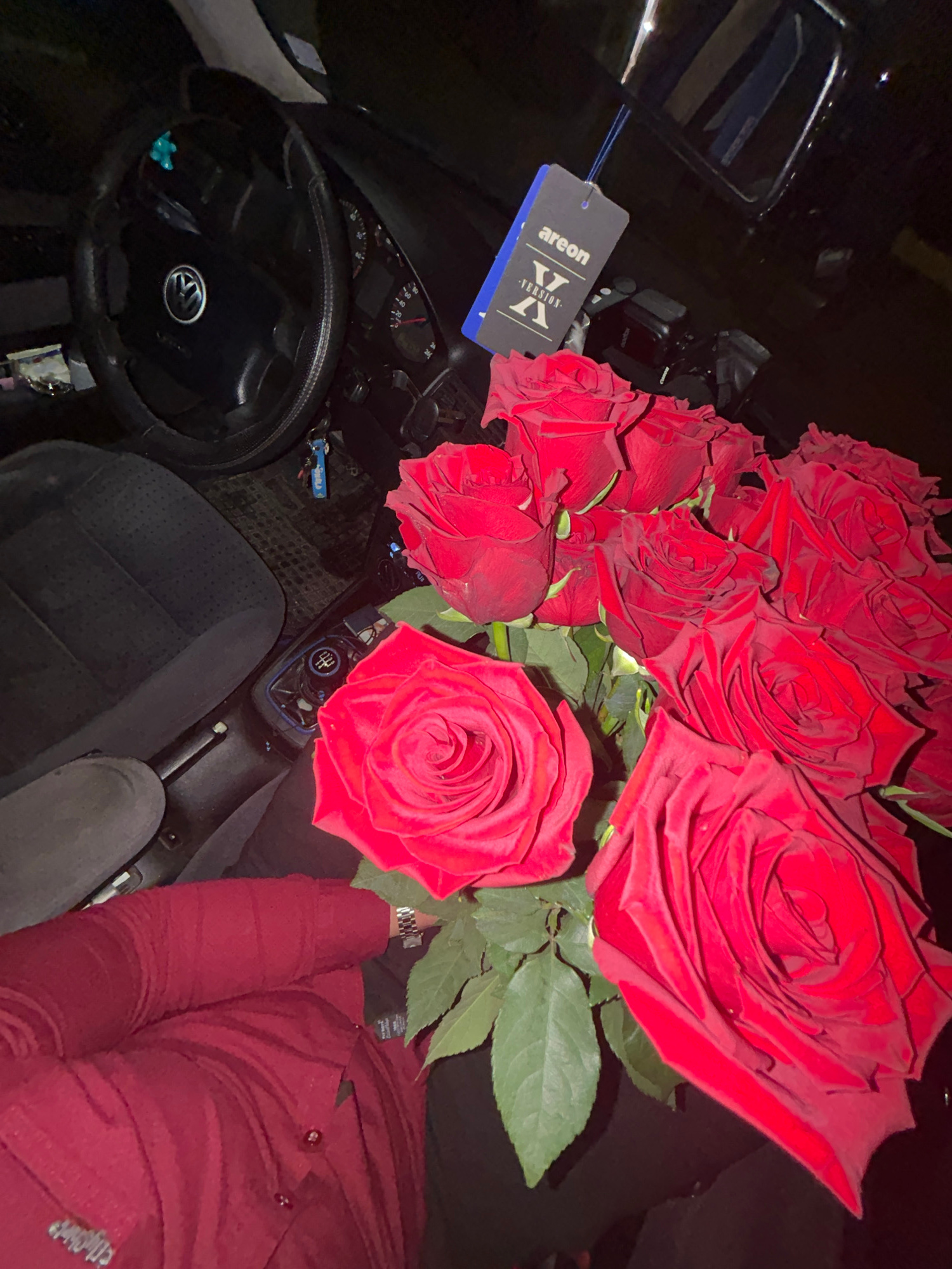 The image shows the interior of a Volkswagen car, specifically the driver's seat and dashboard. A large bouquet of red roses sits in the passenger seat. An "Areon" air freshener hangs from the rearvie…read more