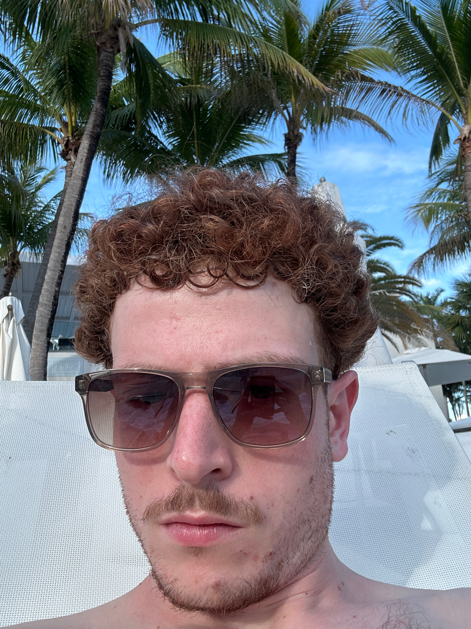 A photograph depicts a person with curly brown hair wearing sunglasses, possibly lying on a white outdoor lounge chair. The background includes palm trees and a blue sky with some clouds. The scene ap…read more