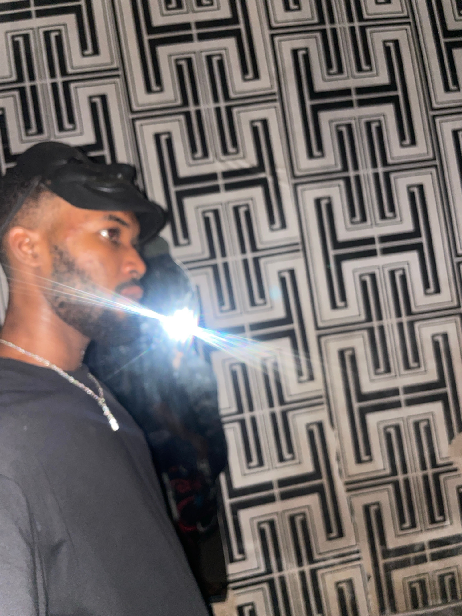 A medium shot shows a person lying on a surface with a black and white geometric pattern. The individual is wearing a black shirt and a black hat and has a silver necklace. The person appears to be ly…read more