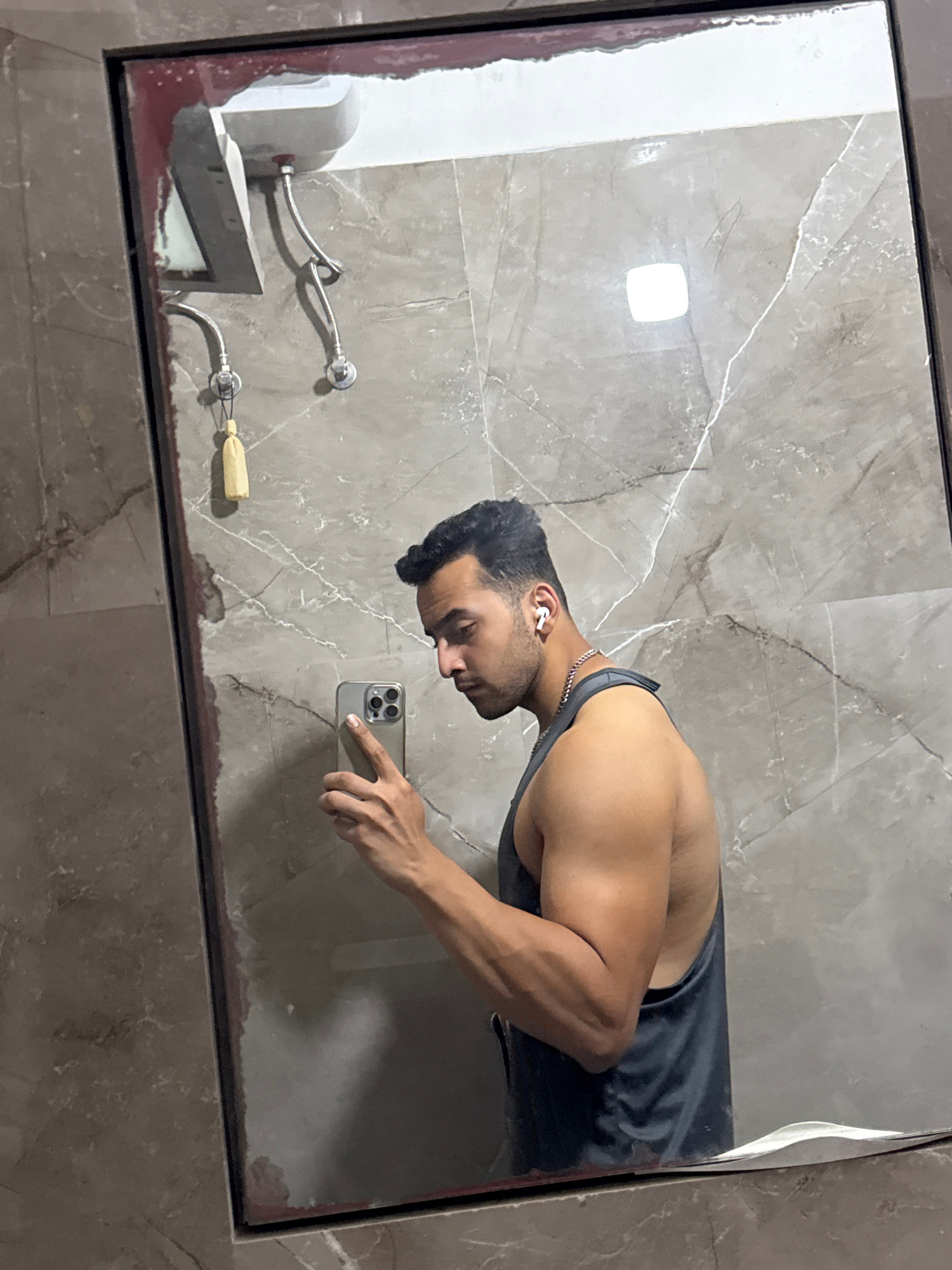 A person is taking a selfie in a bathroom mirror. The bathroom has grey marble tiles. The person is wearing a tank top and has headphones in their ear. They are holding a phone in their right hand. Th…read more