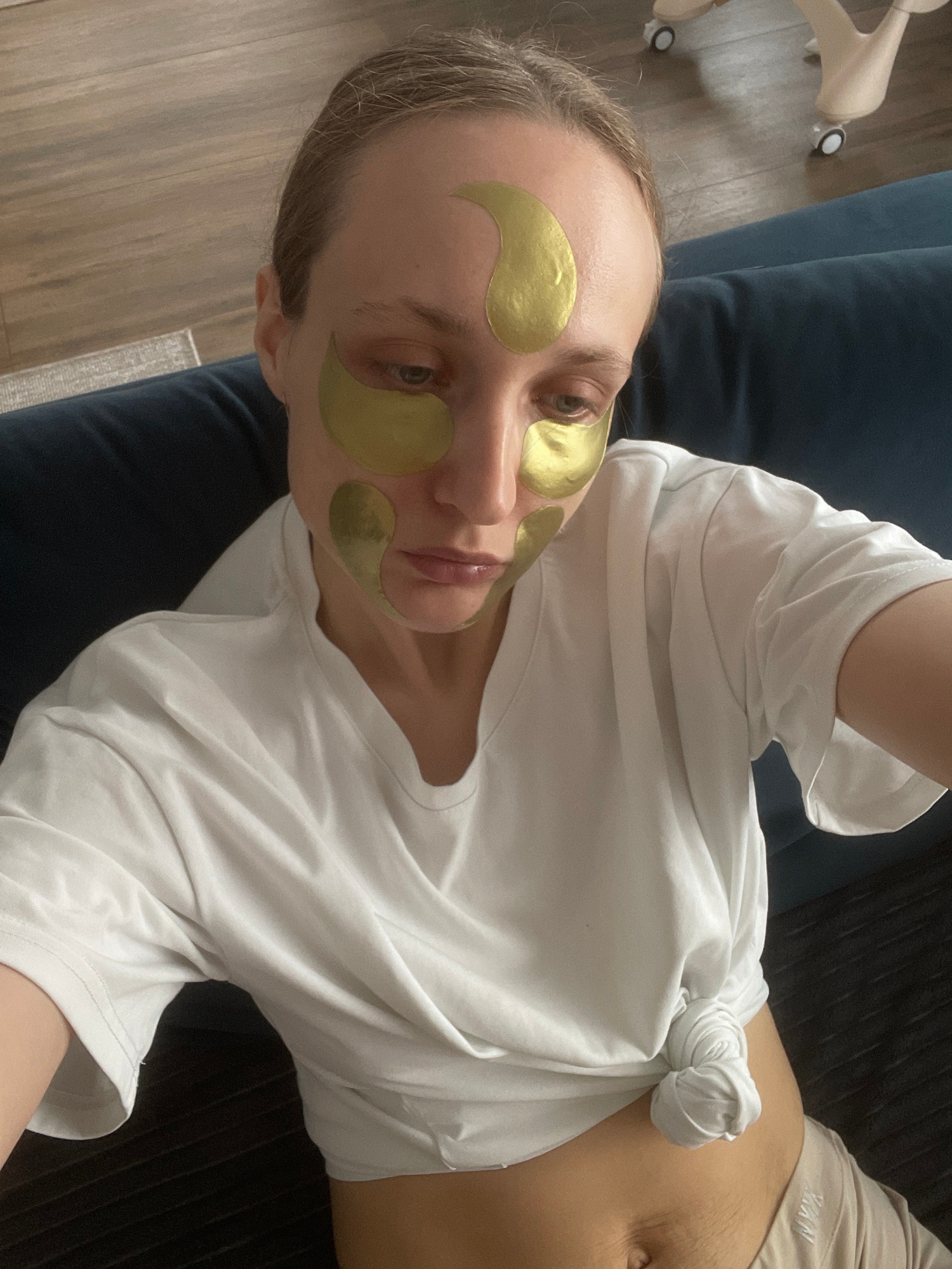 A fair-skinned person is lying on a dark blue cushioned surface, possibly a sofa or bed. The person is wearing a white t-shirt that is knotted at the stomach, revealing a portion of their abdomen. The…read more