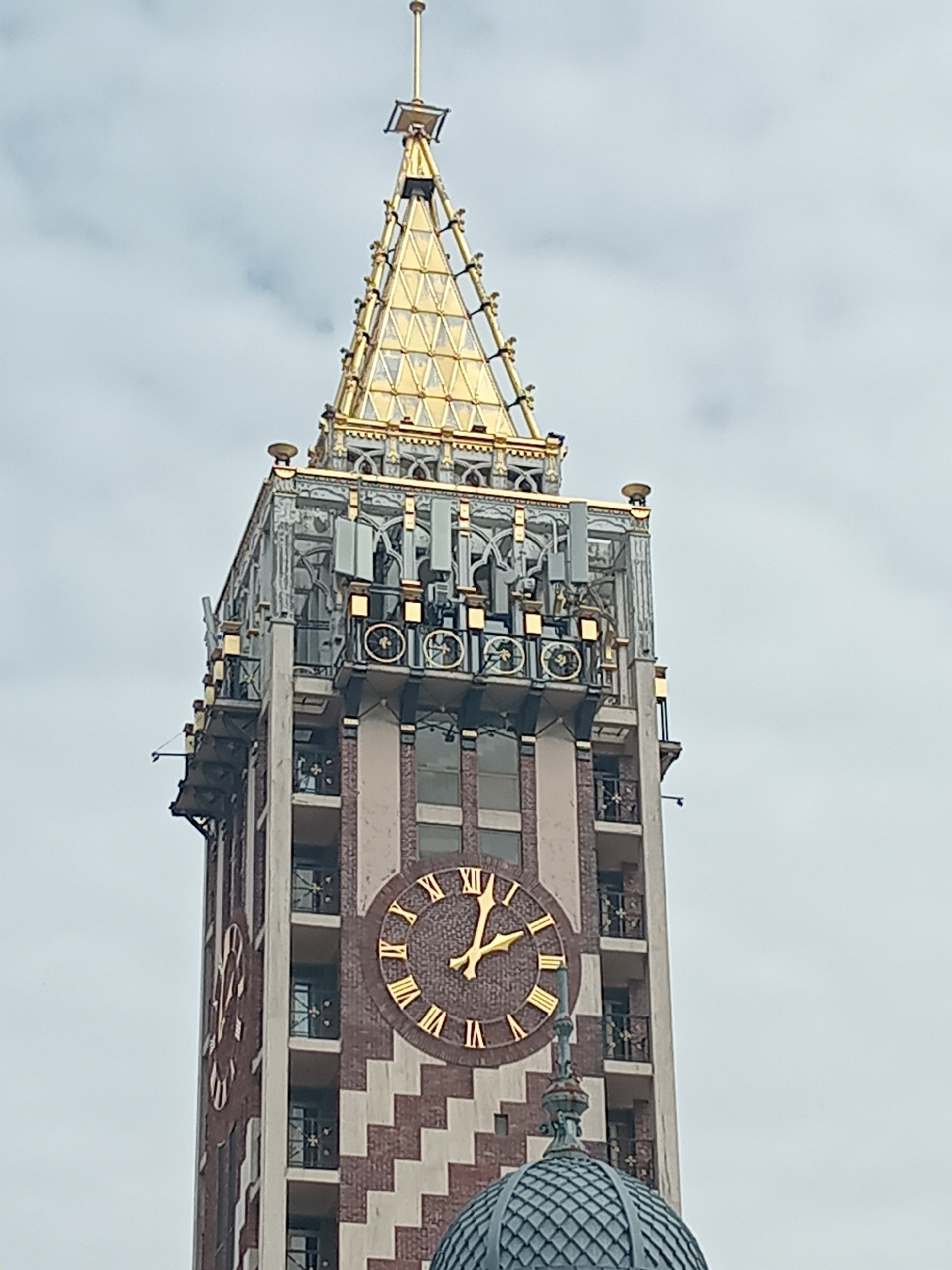 The image shows a close-up, low-angle view of the Astronomical Clock tower in Batumi, Georgia. The clock tower features a gold-colored spire, a complex mechanical structure below the spire, and a larg…read more