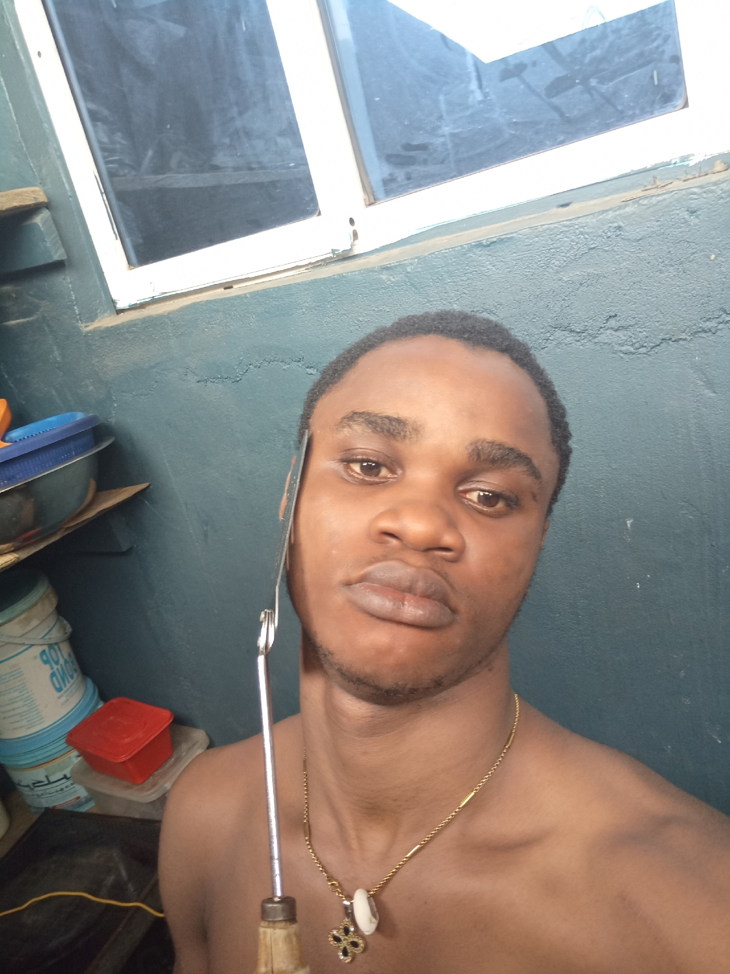 A young, dark-skinned man in Owerri, Nigeria, is featured in a close-up selfie, looking directly at the camera with a neutral to slightly serious expression. He is shirtless, displaying his shoulders…read more