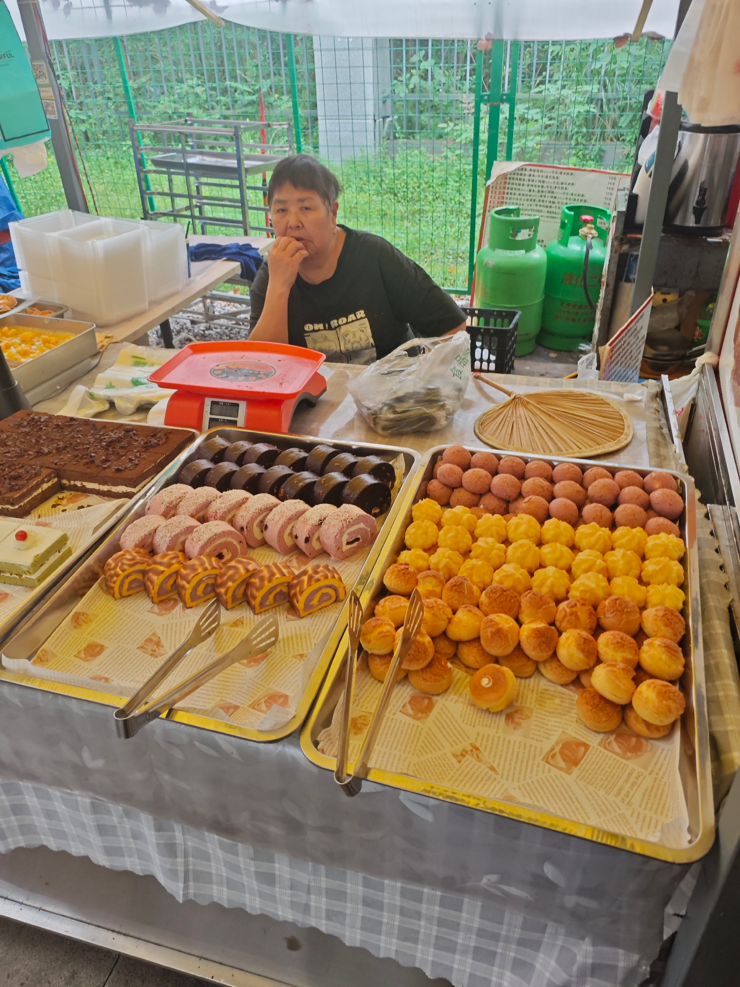 A middle-aged Asian woman is sitting at a table covered with trays of baked goods at an outdoor market. She is wearing a dark t-shirt and has short, dark hair. She is looking at the camera with a neut…read more