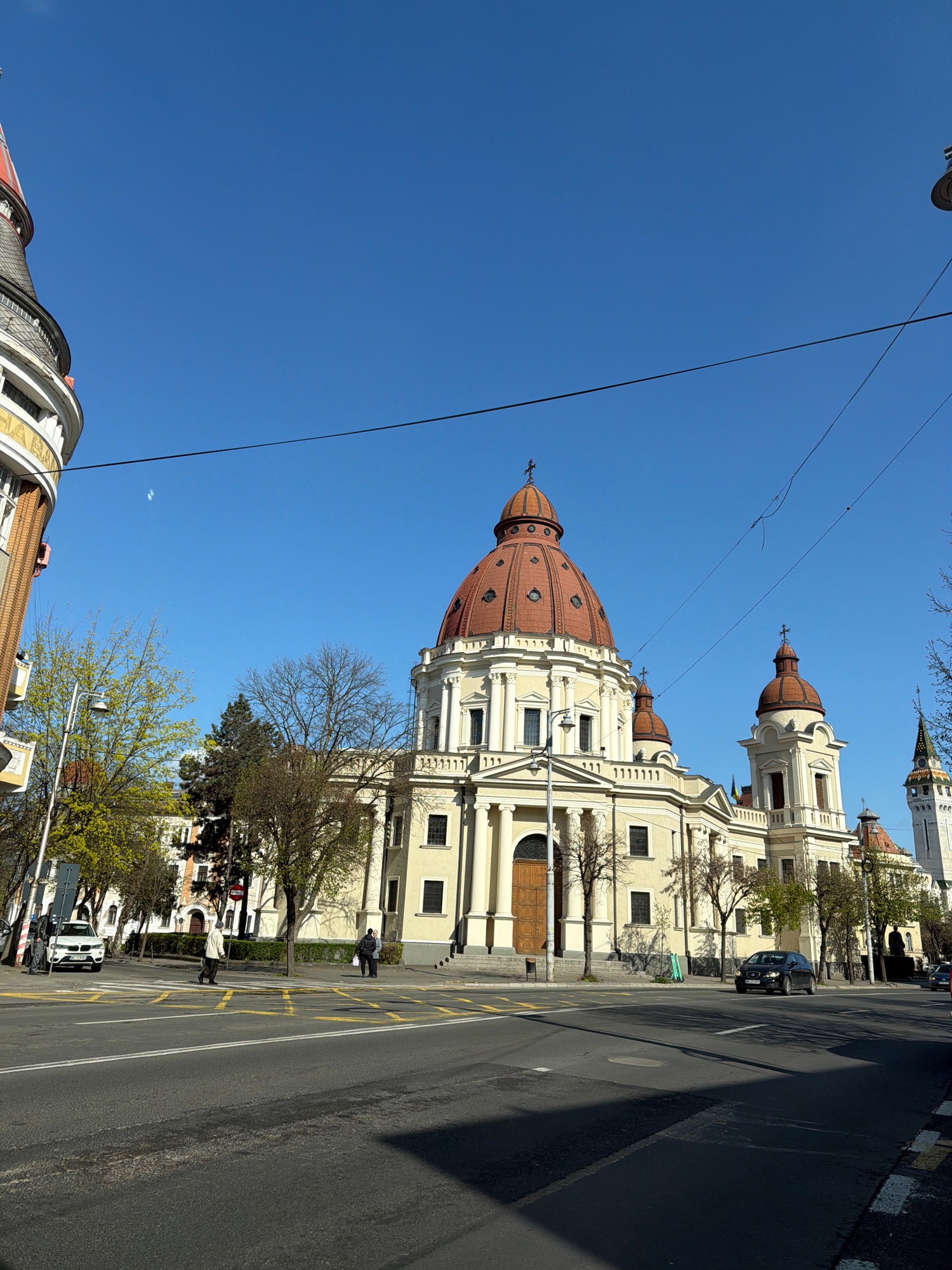 The image captures a street scene in Târgu Mureș, Romania, featuring the prominent St. John the Baptist Church. The church is a light-colored building with a large, reddish-brown dome and smaller towe…read more