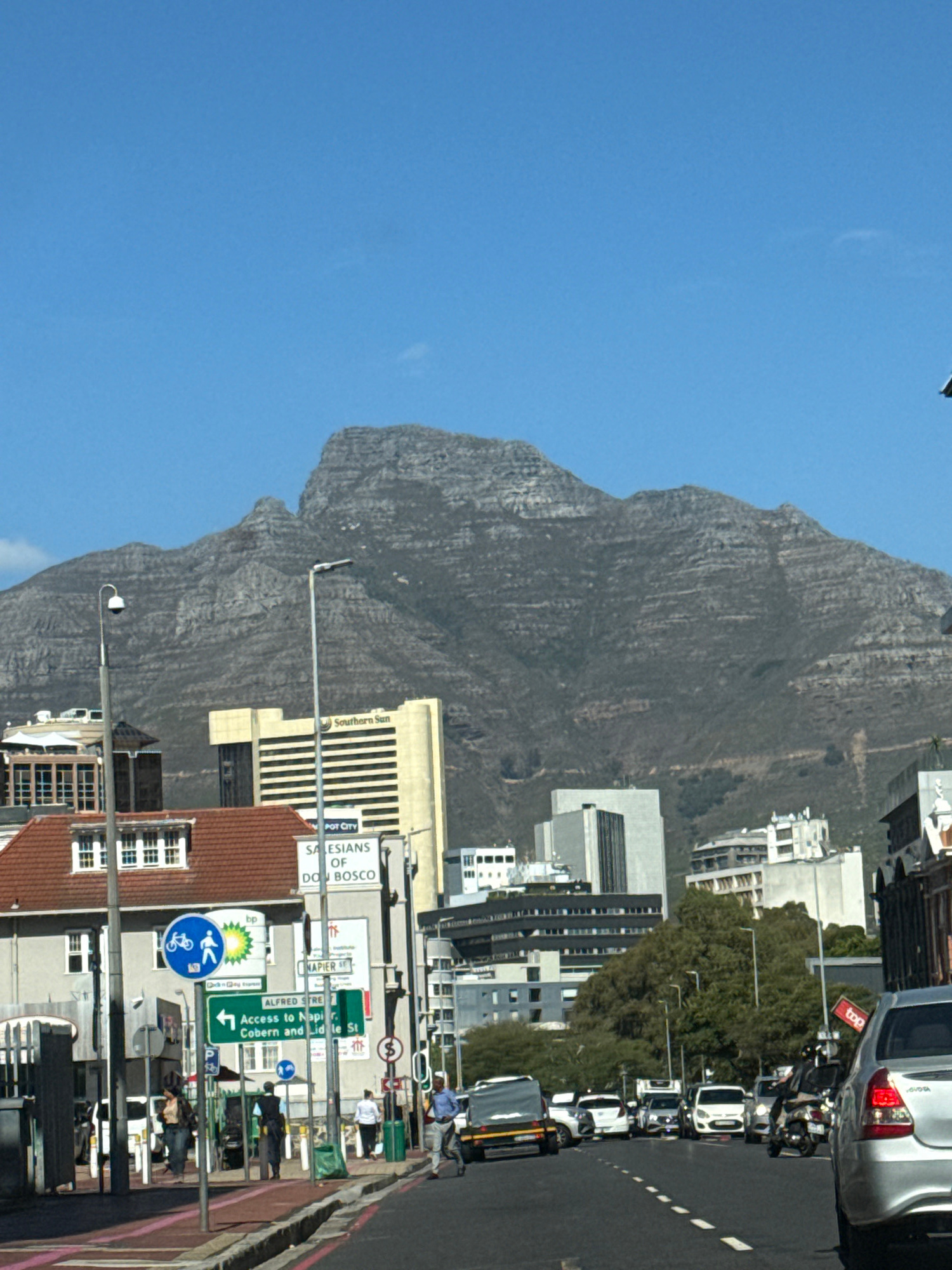 The image, taken in Cape Town, South Africa, captures a sunny daytime street scene with Table Mountain dominating the background under a clear blue sky. The photo is oriented vertically, showing the m…read more