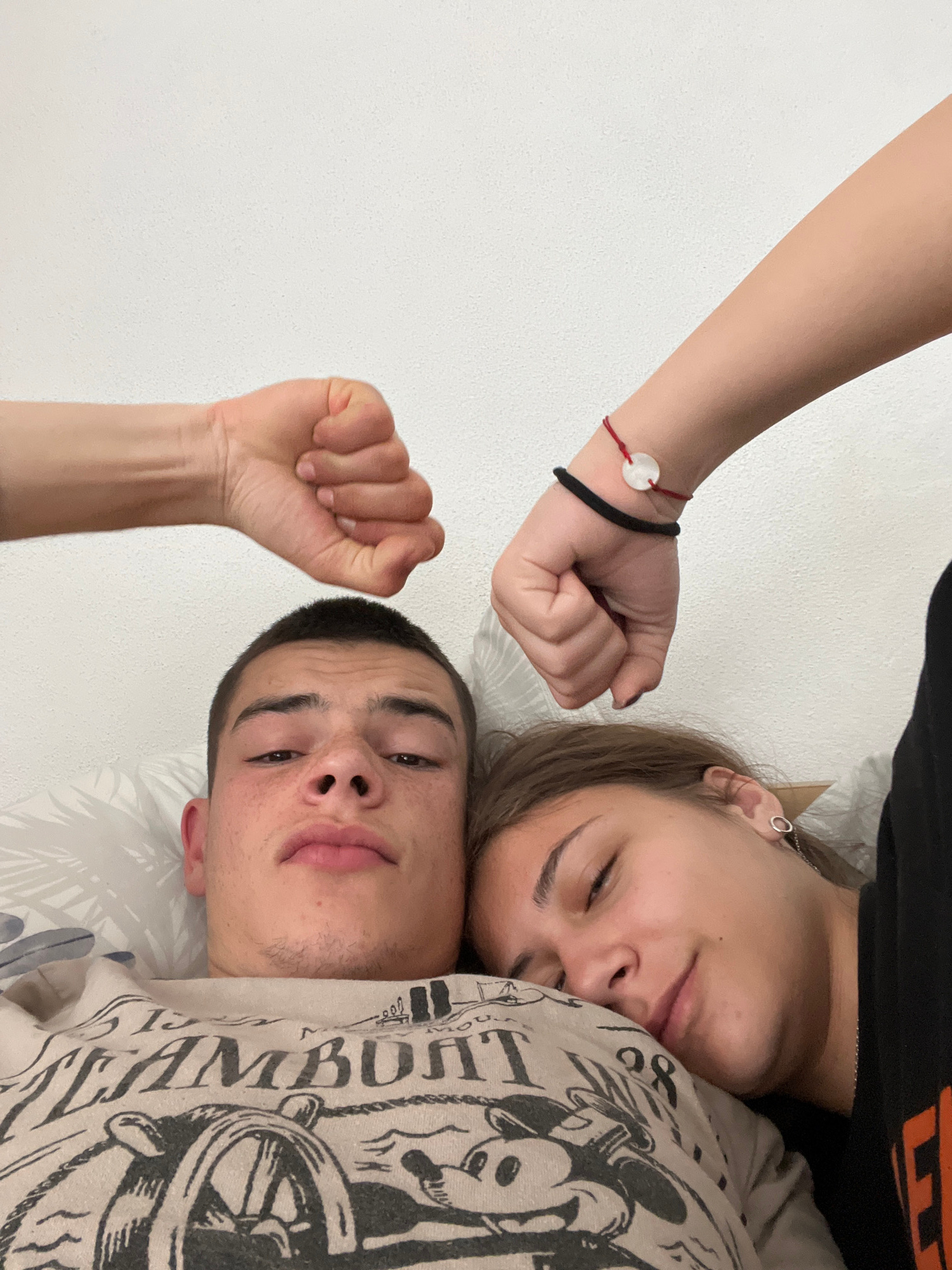 A selfie shows two people lying down with their fists raised. A young woman is lying on her side, with her face visible, wearing a black top and silver hoop earring. A young man is next to her, also l…read more
