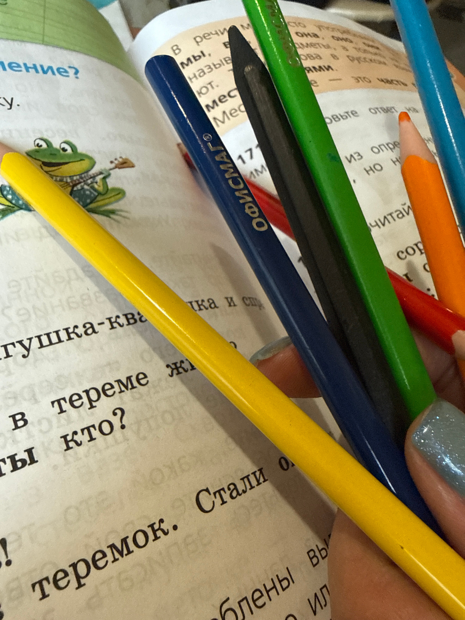The image presents a close-up, overhead view of several colored pencils resting on an open book, set in what appears to be an indoor environment in Dmitrov, Russia. A variety of colored pencils are vi…read more