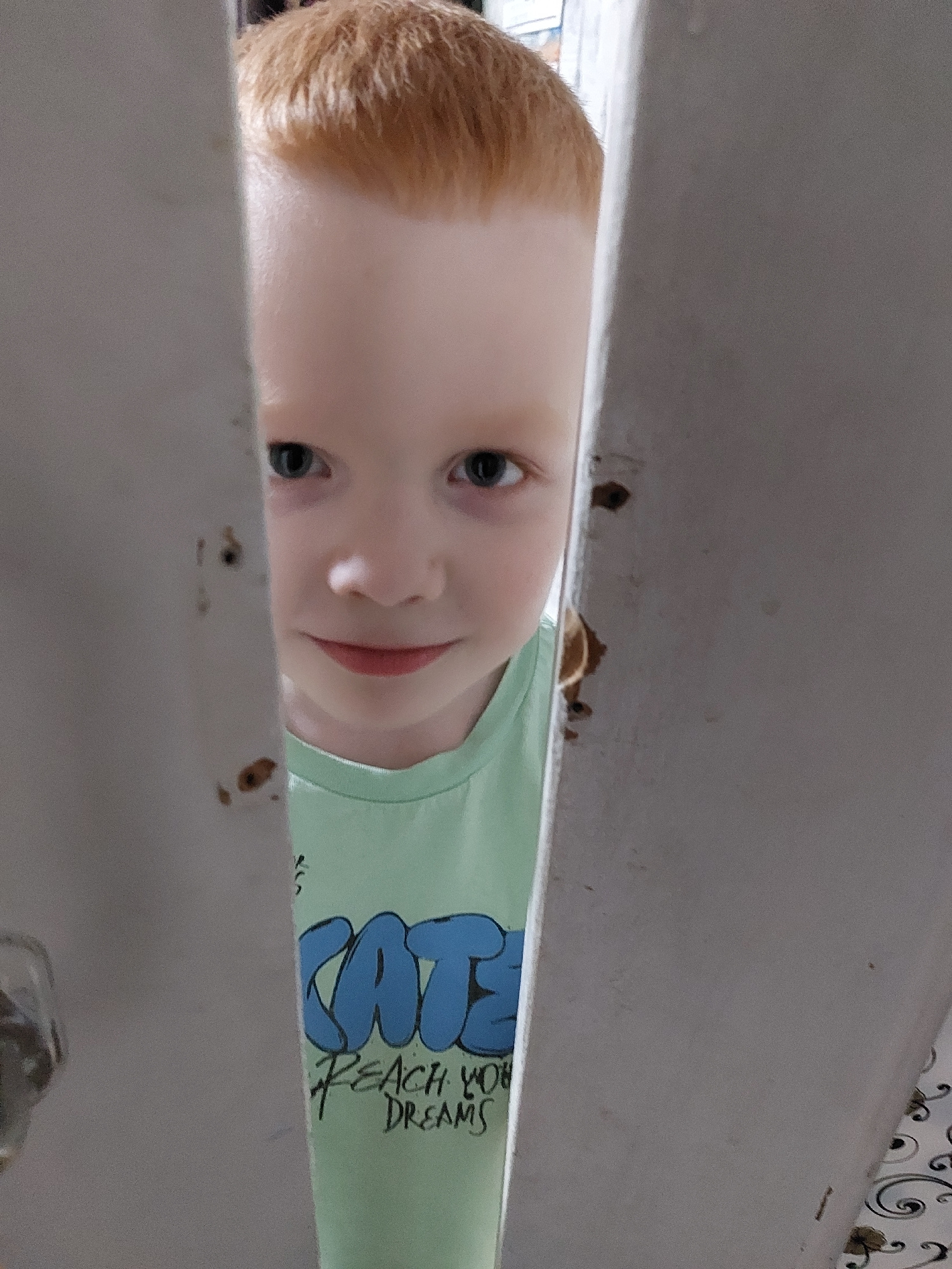 A red-haired child wearing a light green t-shirt with blue lettering is peeking through a gap in what appears to be a painted white wooden structure, potentially a fence or railing. The setting is amb…read more
