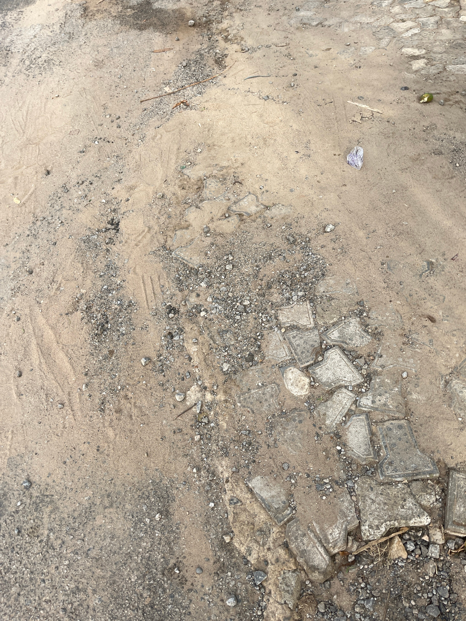 The scene is a close-up of a ground surface, likely a section of an unpaved road or construction site. The surface is mostly composed of sand and gravel. Disrupted pieces of concrete pavement or tiles…read more