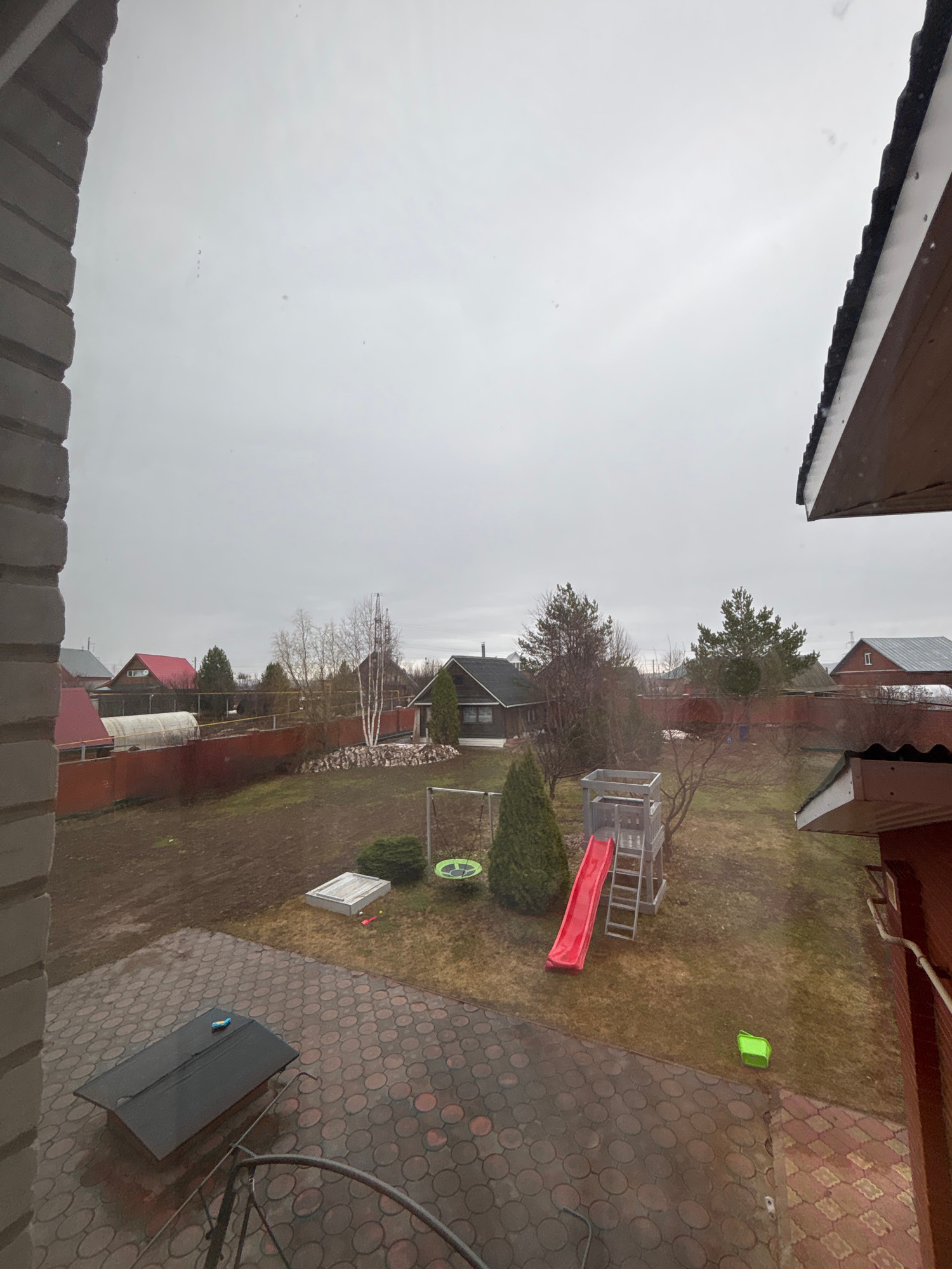 The photograph shows a backyard in Ферма, Russia, under a grey, overcast sky. A children's playground with a red slide is visible. A green bucket sits on the lawn near a brick-paved area, where a dark…read more