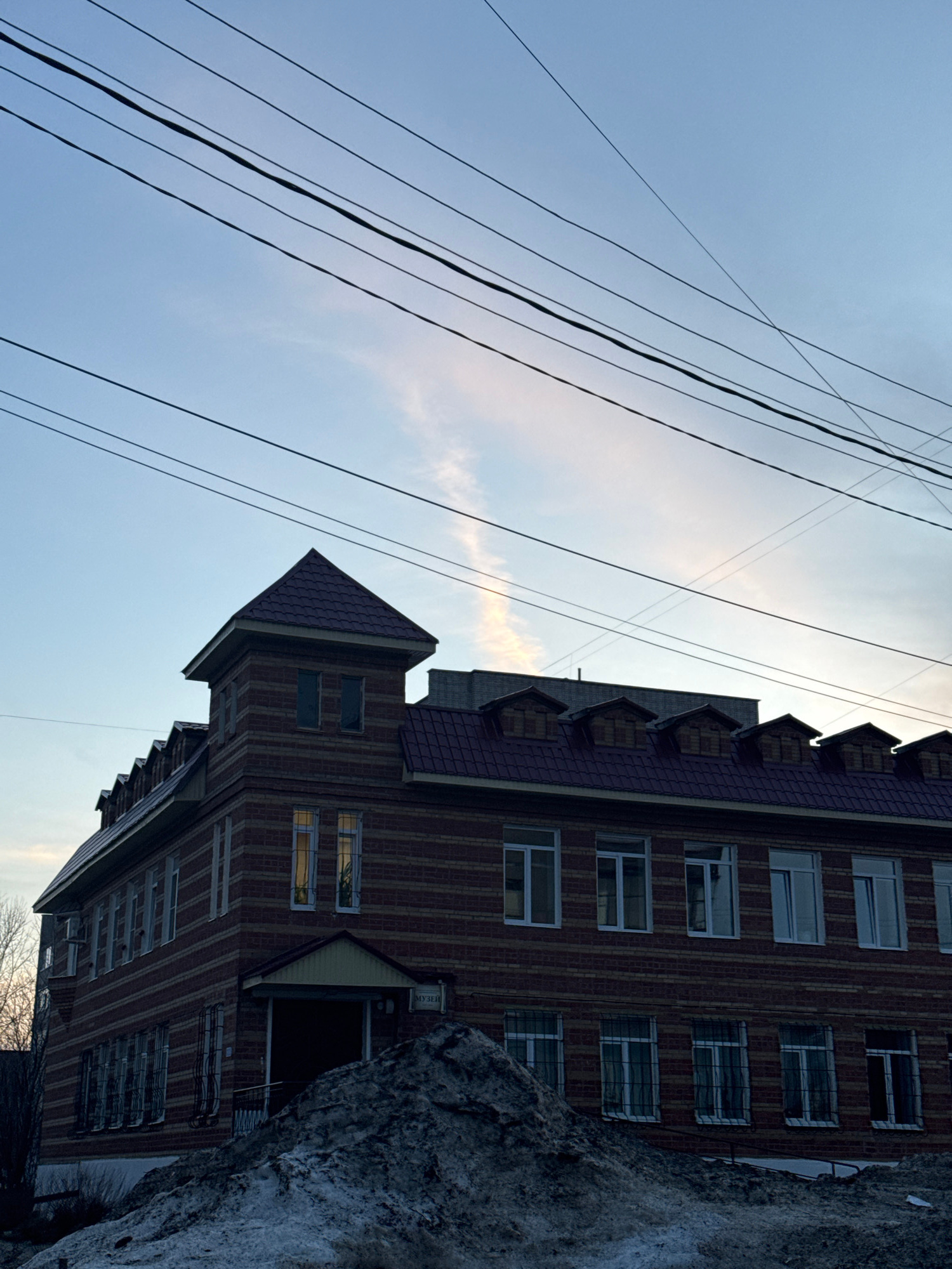 The image shows a multi-story brick building with a distinctive tower and a dark, peaked roof. It is located in the city of Chernushka, Russia, according to signage on the building (unseen but implied…read more