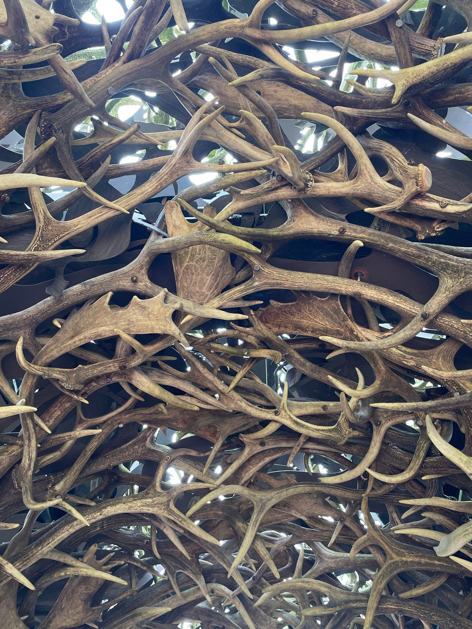 The image shows a dense arrangement of deer antlers, likely used as a decorative element or architectural feature. The antlers are of varying sizes and shapes, creating a textured and intricate patter…read more