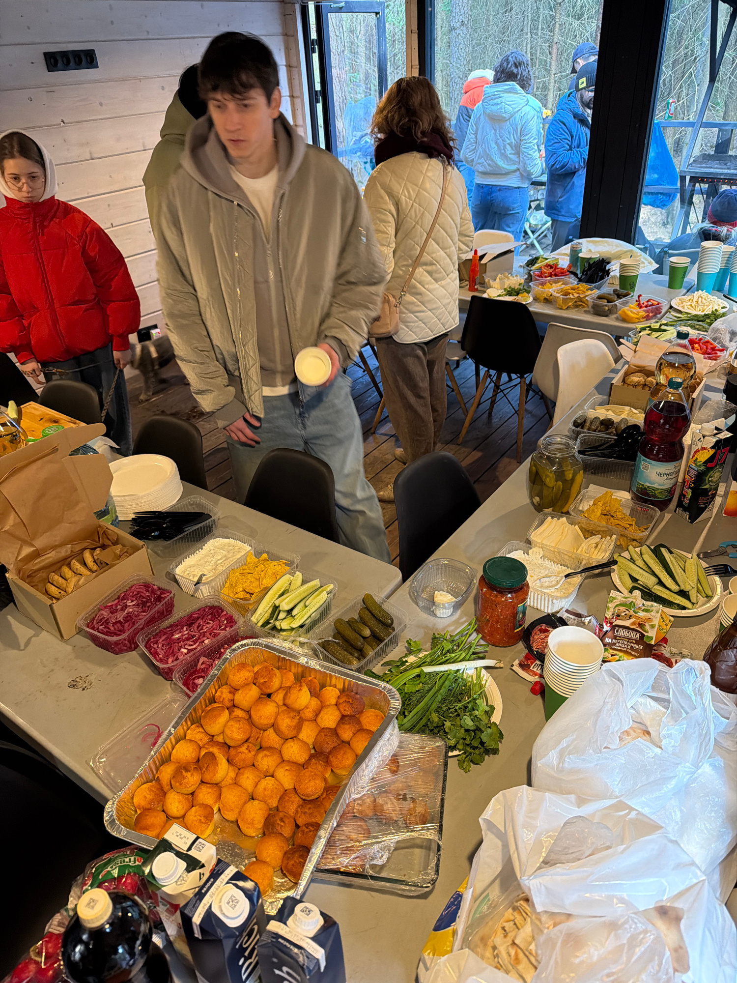 This image depicts a casual indoor gathering around a long table laden with a buffet-style spread of food and drinks. The setting appears to be a modern cabin or building with large windows overlookin…read more