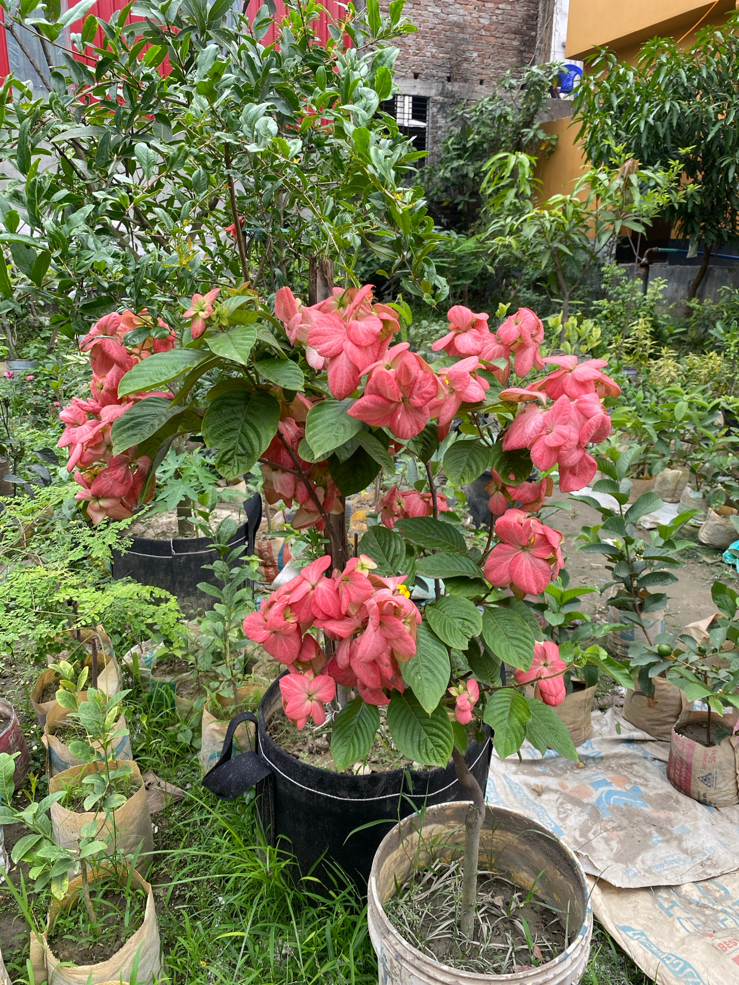 The image shows a lush garden setting, potentially in Dhaka, Bangladesh, suggested by the prevalent plant life and context. The focal point is a flowering plant, possibly a Mussaenda erythrophylla (As…read more