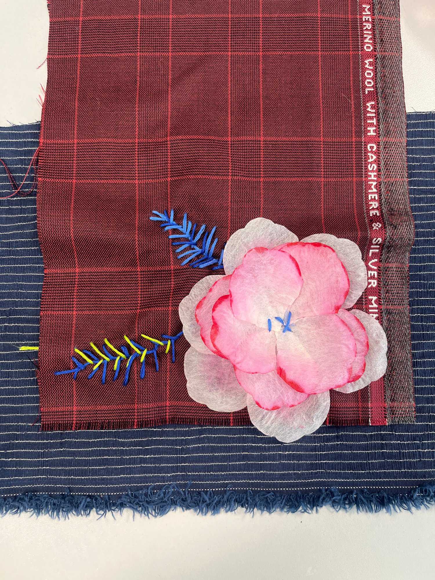 The image shows a close-up of fabric swatches arranged on a white surface. A maroon and red plaid fabric labeled "MERINO WOOL WITH CASHMERE & SILVER MINK" is the primary swatch. On top of this is a pi…read more