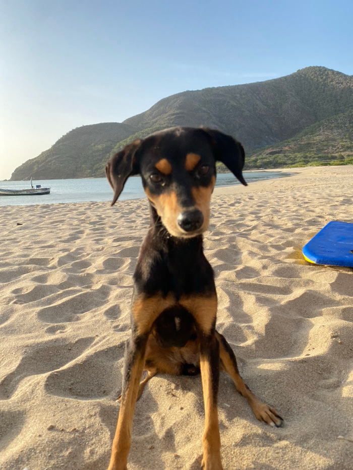 A black and tan domestic dog, exhibiting a mixed breed appearance, sits upright and centered on a sandy beach in Juan Griego, Venezuela. The dog faces the camera directly, its ears partially erect. To…read more