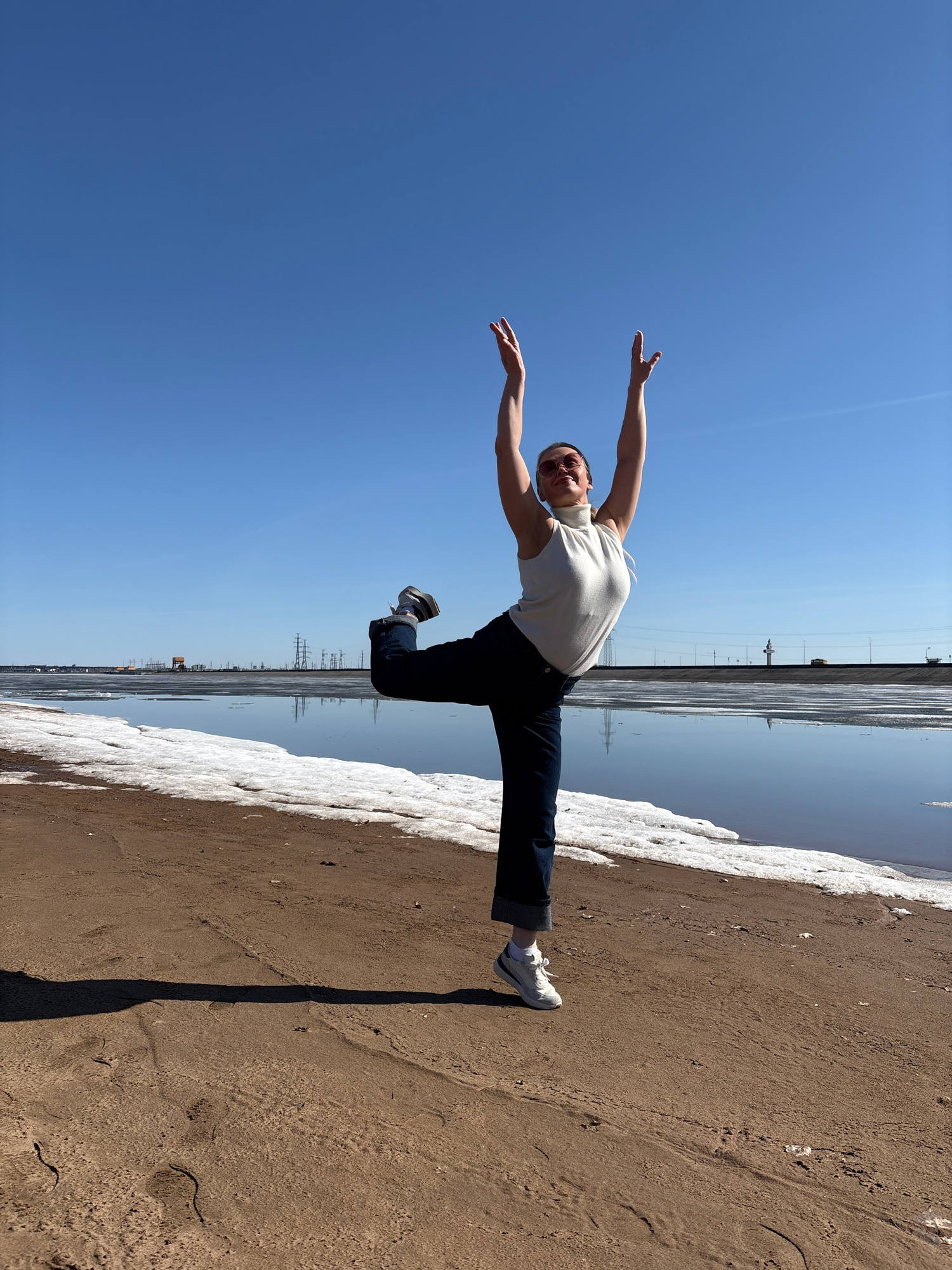 The image displays a dynamic outdoor scene with a person captured in a horizontal, mid-air pose against a bright blue sky. The subject, wearing a light-colored sleeveless top, dark pants rolled at the…read more