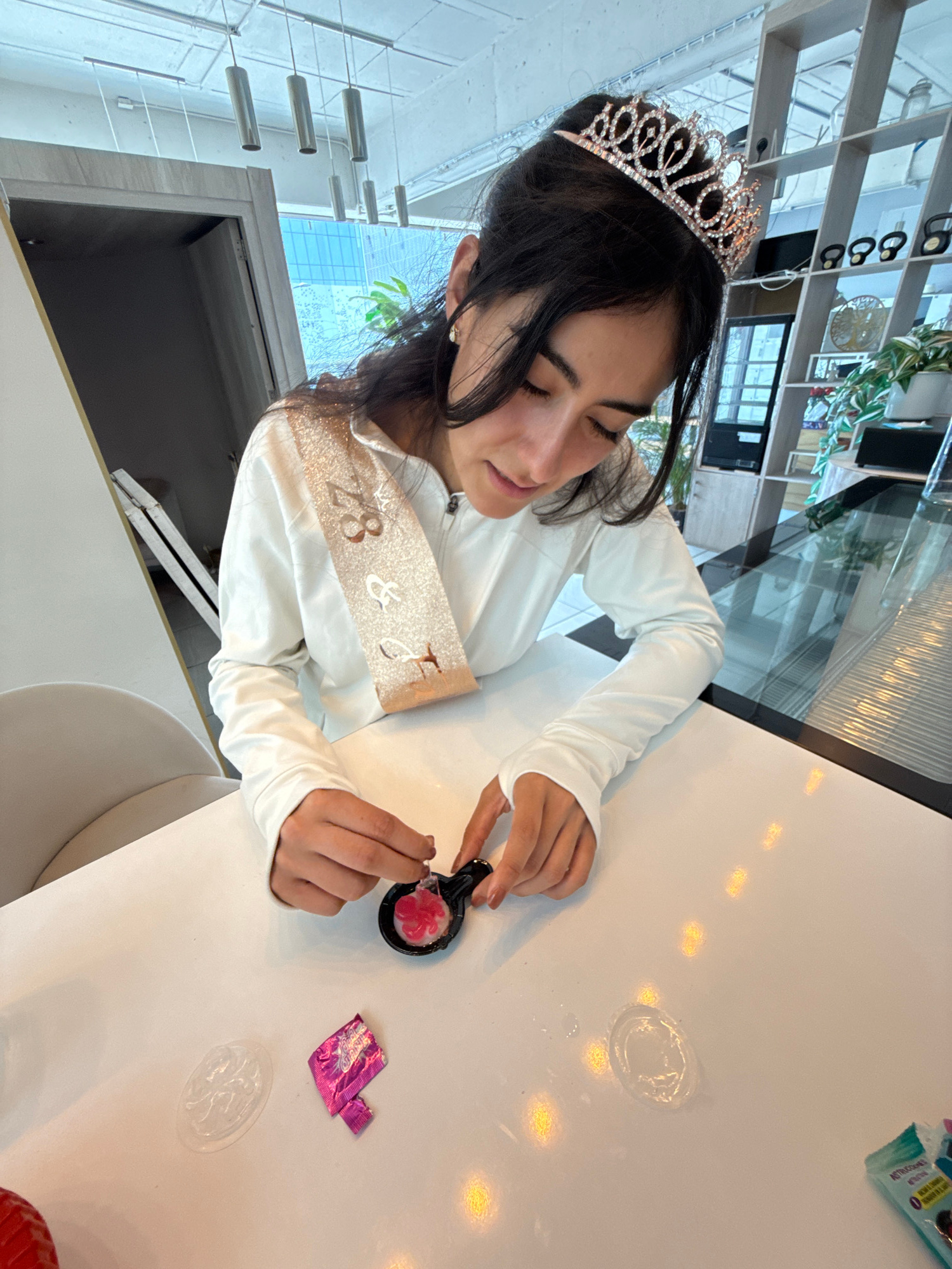 A young woman wearing a tiara and a birthday sash that reads "28 & F" sits at a white table. She is holding a small black dish with a pink treat inside and using a small tool to manipulate the treat.…read more