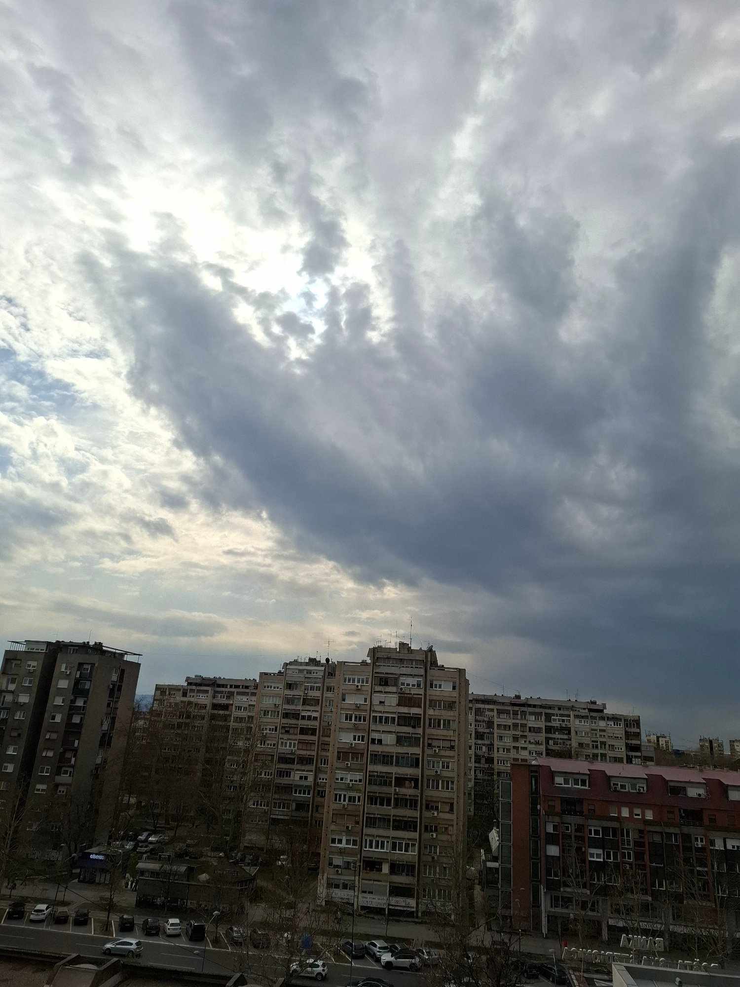 The image presents an elevated daytime view of a residential district within Novi Sad, Serbia, under a heavily clouded sky. The sky displays shades of grey, with brighter areas indicating the obscured…read more