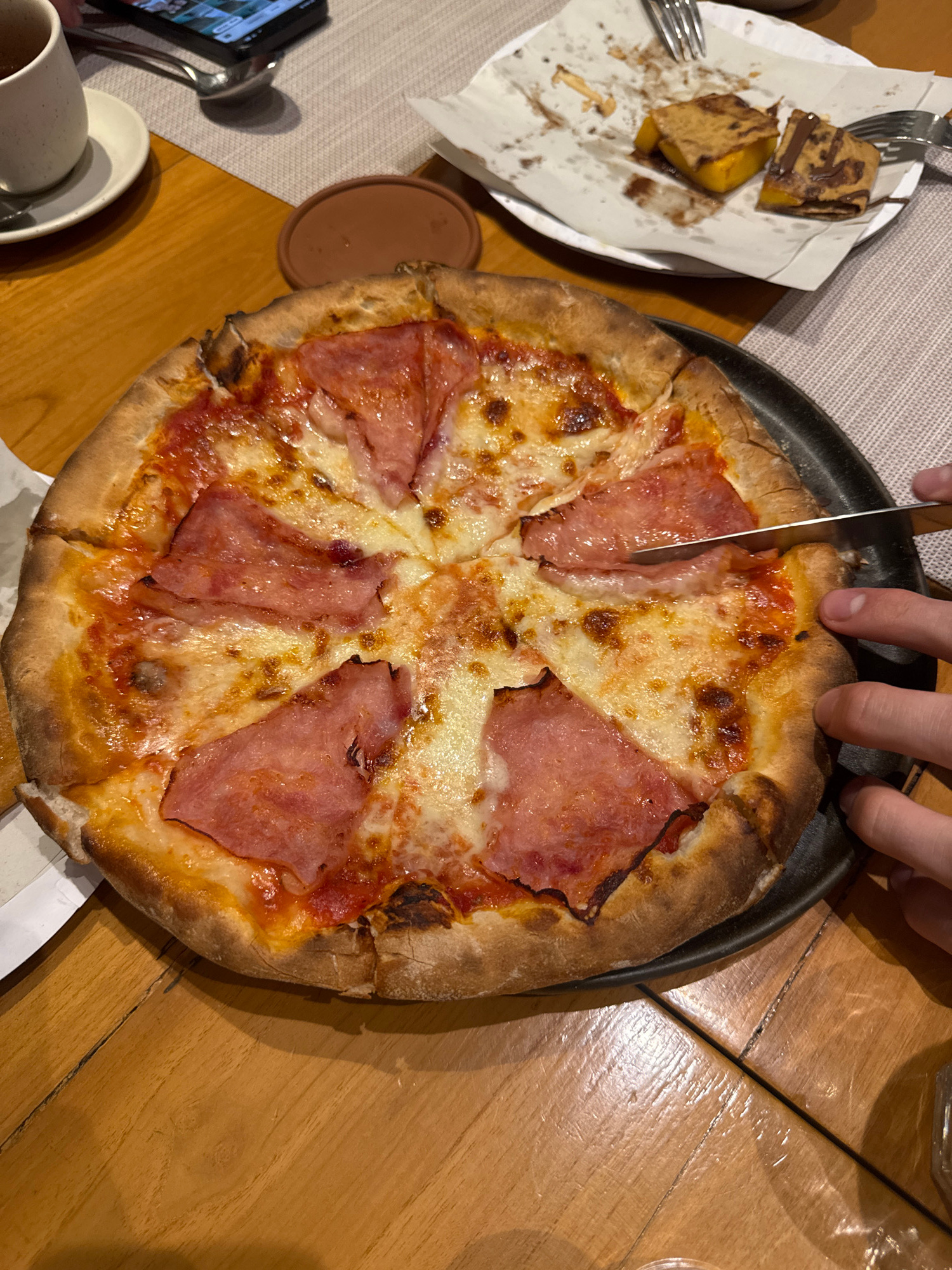 The image shows a partially cut pizza on a dark metal plate, positioned on a light brown wooden table. A person's hand is visible, holding a knife and cutting the pizza. The pizza has a thick crust an…read more