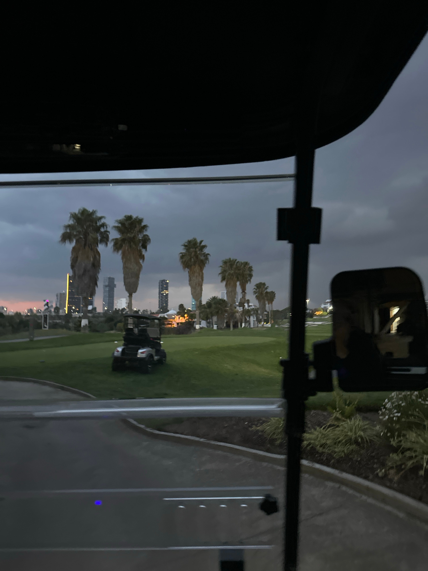 A view from inside a golf cart looking out onto a golf course in San Bernardino Tlaxcalancingo, Mexico. Several palm trees line the golf course with buildings visible in the background. Other golf car…read more