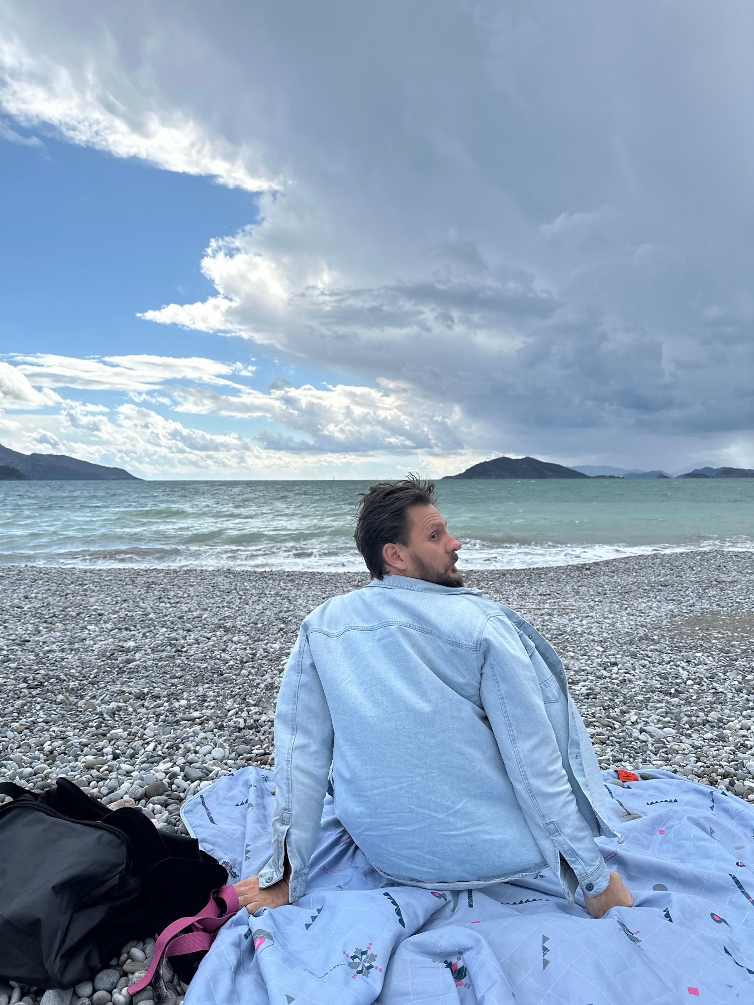 A man sits on a pebble beach in Fethiye, Turkey, looking out at the water. He wears a light blue denim jacket and sits on a light blue patterned blanket. A black bag with a pink strap sits next to him…read more