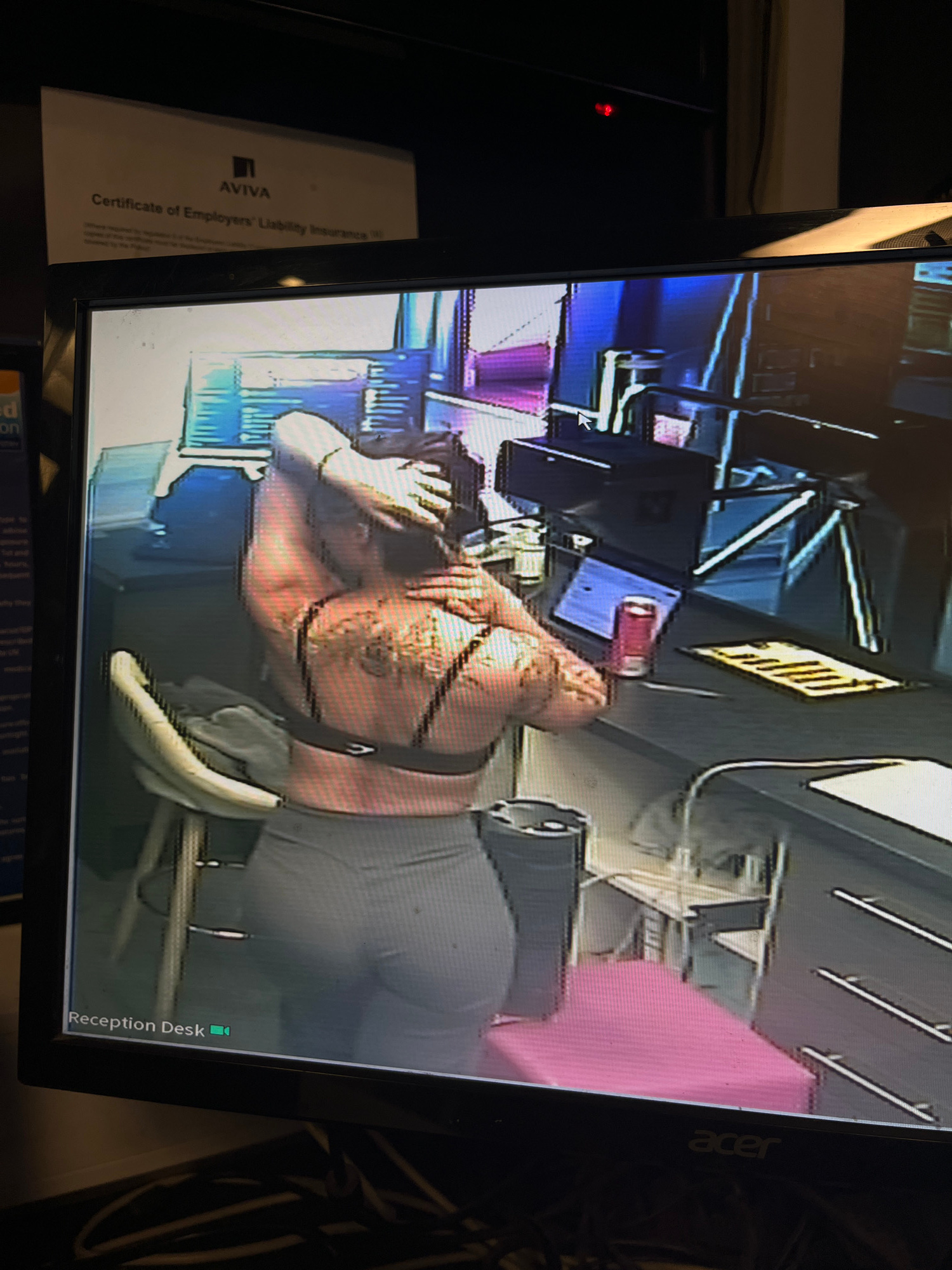 The media file is a photograph of a black Acer monitor displaying a live or recorded video feed, which appears to be from a CCTV camera. The monitor is oriented vertically in the image frame, but the…read more