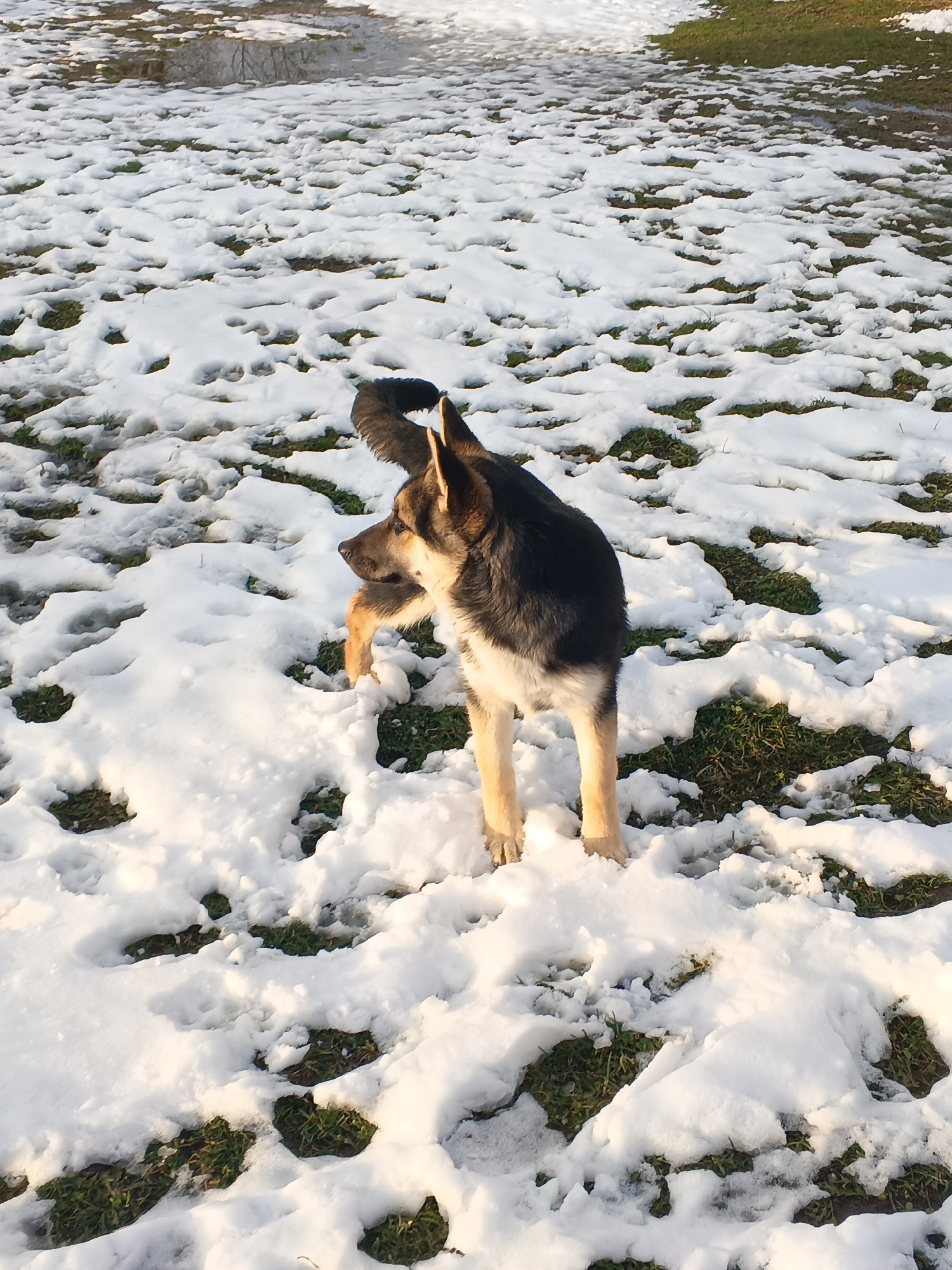 An outdoor scene captures a dog standing in a field partially covered by snow, with patches of green grass visible underneath. The dog, appearing to be a German Shepherd mix, has black fur on its back…read more