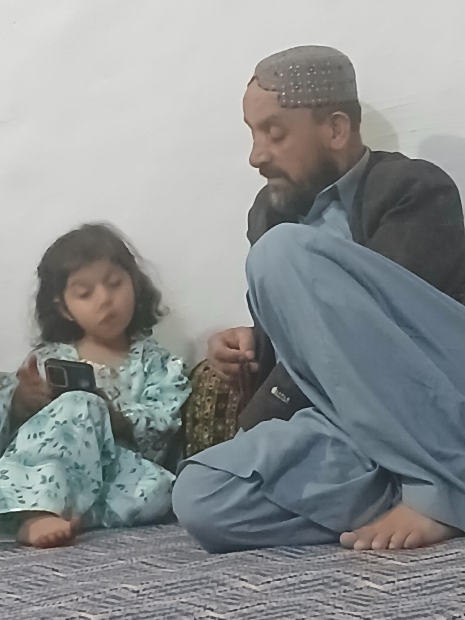 An indoor scene in Quetta, Pakistan, features two individuals: an adult male and a young girl, both seated on a patterned gray and white woven floor mat. The plain background is a light-colored wall.…read more