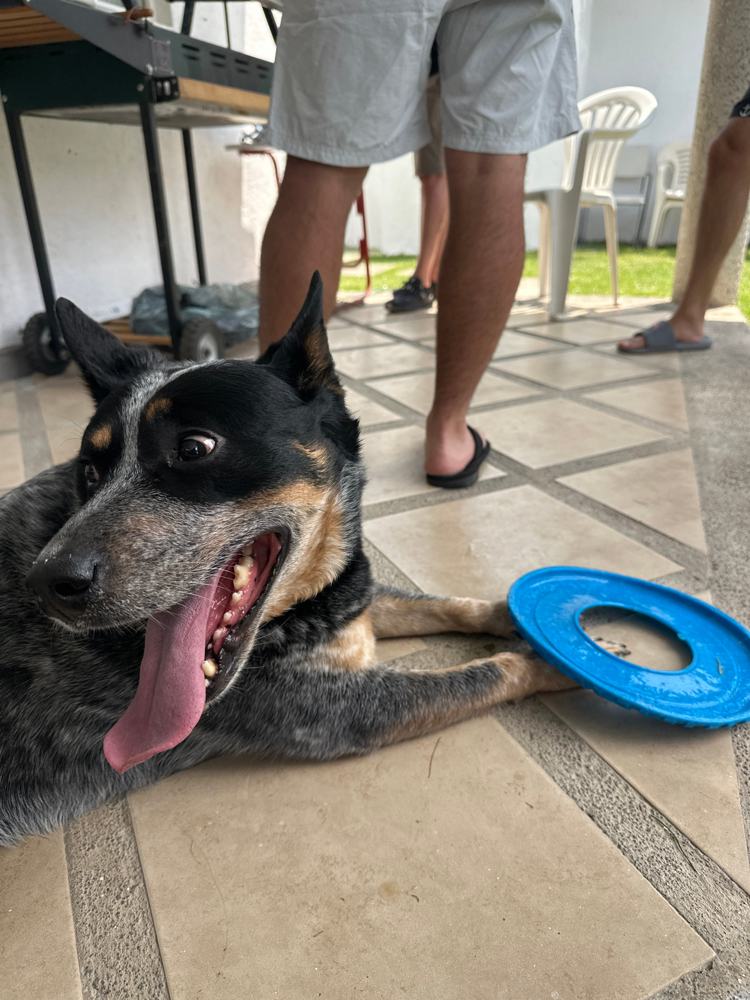 A medium shot presents an Australian Cattle Dog lying on its back, positioned to the right and slightly angled upward. Its mouth is open, tongue protruding, with a blue plastic toy situated above its…read more