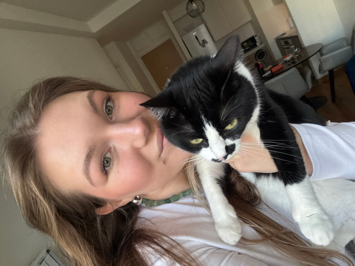 The image displays an indoor scene featuring a female individual holding a domestic cat. The female's face, right shoulder, and upper arm are prominent on the left side of the frame. She has long brow…read more