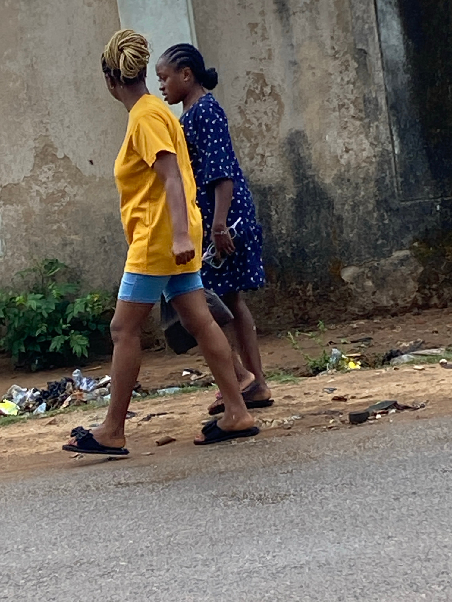 Two individuals walk on an asphalt road alongside a dilapidated concrete structure. The person in the foreground wears a yellow shirt and blue shorts, while the other is in a blue patterned dress. Bot…read more